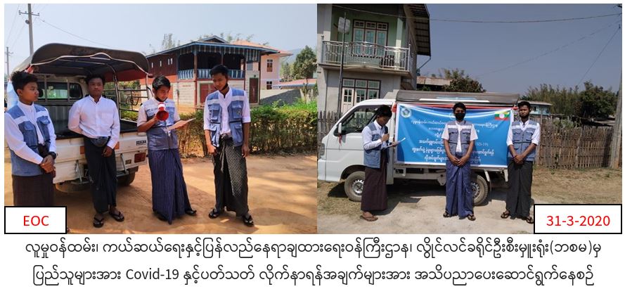 လူမှုဝန်ထမ်း၊ ကယ်ဆယ်ရေးနှင့်ပြန်လည်နေရာချထားရေးဝန်ကြီးဌာန၊ ဘေးအန္တရာယ်ဆိုင်ရာစီမံခန့်ခွဲမှုဦးစီးဌာန၊ လွိုင်လင်ခရိုင်ဦးစီးမှူးရုံးမှ တာဝန်ရှိသူများသည် (၃၁.၃.၂၀၂၀)ရက်နေ့ ( ၃း၀၀ )နာရီအချိန်တွင် လွိုင်လင်မြို့နယ်၊ နောင်ဟူးကျေးရွာ၊ ဝမ်လုံကျေးရွာတို့၌ အသက်ရှူလမ်းကြောင်းဆိုင်ရာရောဂါ (Covid-19)နှင့်ပတ်သက်၍ ဆောင်ရန် ရှောင်ရန်များ၊ ညွှန်ကြားချက်များ၊ ဥပဒေများကို ကျေးရွာမိဘပြည်သူများကို အသိပညာပေး ပန်ကြားခြင်း လုပ်ငန်းများဆောင်ရွက်ခဲ့ကြောင်း သတင်းရရှိပါသည်။