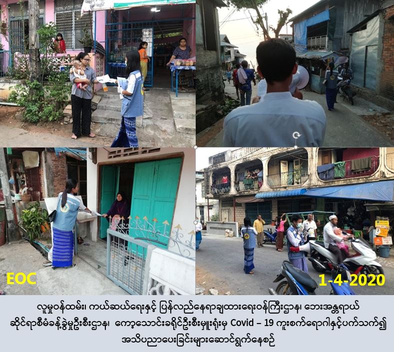 လူမှုဝန်ထမ်း၊ ကယ်ဆယ်ရေးနှင့် ပြန်လည်နေရာချထားရေးဝန်ကြီးဌာန၊ ဘေးအန္တရာယ် ဆိုင်ရာစီမံခန့်ခွဲမှုဦးစီးဌာန၊ ကော့သောင်းခရိုင်ဦးစီးမှူးရုံးမှ တာဝန်ရှိသူများသည် (၃၁- ၃-၂၀၂၀) ရက်နေ့တွင် ကော့သောင်းမြို့၊ ဘုရင့်နောင်ရပ်ကွက်အတွင်းရှိ ပြည်သူများအား covid – 19 ရောဂါနှင့်ပက်သက်၍ အသိပညာပေးခြင်း၊ လိုက်လံဆော်သြခြင်း၊ လက်ကမ်းစာစောင်များ ဖြန့်ဝေခြင်းများ ဆောင်ရွက်ခဲ့ကြောင်းသတင်းရရှိပါသည်။