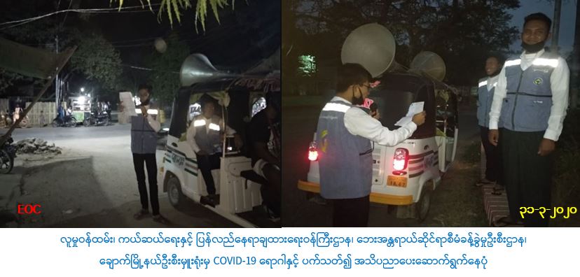 လူမှုဝန်ထမ်း၊ ကယ်ဆယ်ရေးနှင့် ပြန်လည်နေရာချထားရေးဝန်ကြီးဌာန၊ ဘေးအန္တရာယ်ဆိုင်ရာစီမံခန့်ခွဲမှုဦးစီးဌာန၊ ချောက်မြို့နယ်ဦးစီးမှူးရုံးမှ တာဝန်ရှိသူများသည် (၃၁-၃-၂၀၂၀)ရက်နေ့တွင် ချောက်မြို့နယ်အတွင်းရှိ အမှတ်(၁၁)၊ အမှတ်(၁၂)၊ အမှတ်(၁၃)၊ အမှတ်(၁၄)နှင့် အမှတ်(၁၅)ရပ်ကွက်များသို့ covid 19 ရောဂါ ကာကွယ်ထိန်းချုပ်ရေးနှင့် အသိပညာပေးခြင်းကို ဆောင်ရွက်ခဲ့ပါကြောင်း သတင်းရရှိပါသည်။
