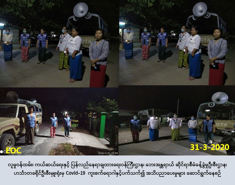 လူမှုဝန်ထမ်း၊ ကယ်ဆယ်ရေးနှင့် ပြန်လည်နေရာချထားရေးဝန်ကြီးဌာန၊ ဘေးအန္တရာယ်ဆိုင်ရာ စီမံခန့်ခွဲမှုဉီးစီးဌာန၊ ဟင်္သာတခရိုင်ဦးစီးမှူးရုံးမှ တာဝန်ရှိသူများသည် လူမှုဝန်ထမ်းနှင့်ပူးပေါင်း၍ (၃၁-၃-၂၀၂၀) ရက်နေ့၊ ည (၂၀ :၀၀) နာရီအချိန်မှစတင်ပြီး ဟင်္သာတမြို့နယ်၊ (တာငါး ဆယ် တောင်ရပ်ကွက်/မြောက်ရပ်ကွက်၊ လက်သမားရပ်ကွက်တို့တွင် လှည့်လည်ပြီး လတ်တလော ဖြစ်ပွားလျှက်ရှိသော COVID -19 ကူးစက်ရောဂါနှင့်ပတ်သက်၍ ဆောင်ရန်/ ရှောင်ရန်တို့အား ရပ်ကွက်နေပြည်သူတို့အား အသိပညာပေးဟော ပြောဆောင်ရွက်ခဲ့ကြောင်းသတင်းရရှိပါသည်။