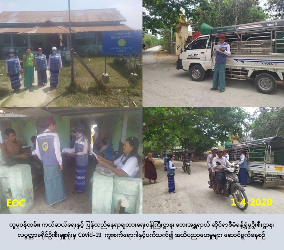 လူမှုဝန်ထမ်း၊ ကယ်ဆယ်ရေးနှင့် ပြန်လည်နေရာချထားရေးဝန်ကြီးဌာန၊ ဘေးအန္တရာယ်ဆိုင်ရာ စီမံခန့်ခွဲမှုဉီးစီးဌာန၊ လပွတ္တာခရိုင်ဦးစီးမှူးရုံးမှ တာဝန်ရှိသူများသည် (၁-၄-၂၀၂၀)ရက်နေ့၊ နံနက်(၀၈ : ၀၀) နာရီမှ (၁၁ : ၃၀) နာရီအချိန်ထိ လပွတ္တာမြို့နယ် ၊ သင်္ဃန်းကြီးကျေးရွာအုပ်စု၊ သင်္ဃန်းကြီးကျေးရွာ၊ ဇင်ရွဲလေးကျေးရွာ၊ ဥက္ကံကျေးရွာများသို့ သွားရောက်၍ COVID-19 နှင့် ပတ်သက်၍ ဆောင်ရန်/ ရှောင်ရန်များအား လိုက်နာဆောင်ရွက်သွားကြရန် အသံချဲ့စက်ဖြင့် လှည့်လည်၍ အသိပေးပြောကြားခဲ့ကြောင်း သတင်းရရှိပါသည်။
