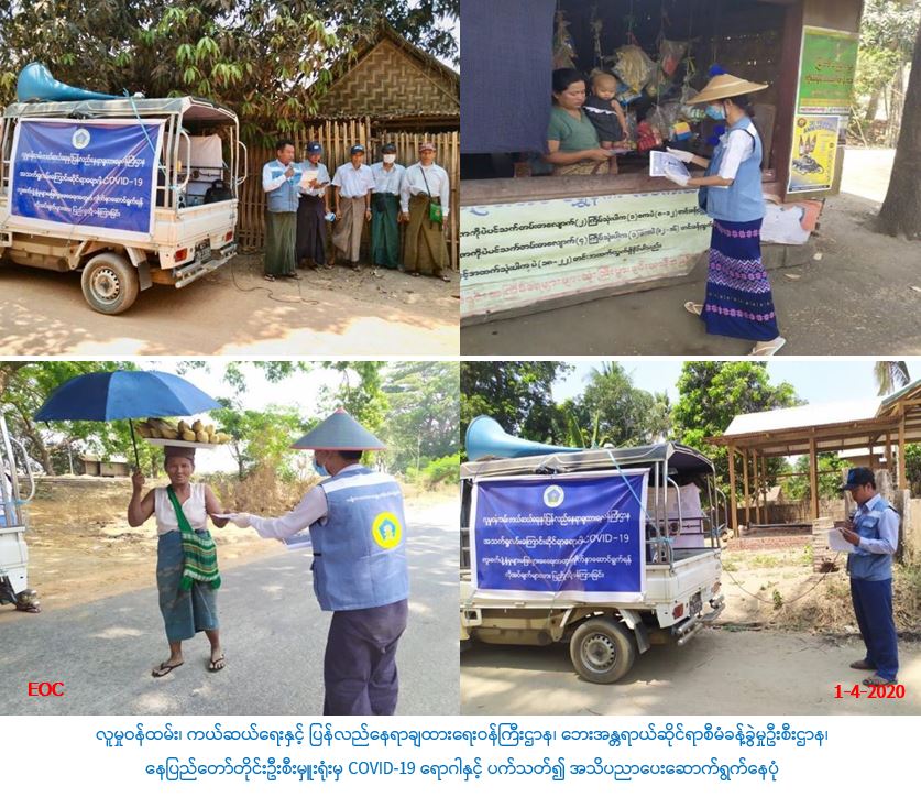 လူမှုဝန်ထမ်း၊ ကယ်ဆယ်ရေးနှင့် ပြန်လည်နေရာချထားရေးဝန်ကြီးဌာန၊ ဘေးအန္တရာယ်ဆိုင်ရာစီမံခန့်ခွဲမှုဦးစီးဌာန၊ ပြည်ထောင်စုနယ်မြေ၊ နေပြည်တော်တိုင်းဦးစီးမှူးရုံးမှ တာဝန်ရှိသူများသည် (၁-၄-၂၀၂၀) ရက်နေ့ (၁၀း၃၀) အချိန်မှ(၁၃း၃၀) အချိန်ထိ ပြည်သူများအား COVID-19 ရောဂါကူးစက်ပြန့်နှံ့မှုများ မဖြစ်ပွားစေရန်အတွက် သိရှိလိုက်နာဆောင်ရွက်ရမည့် အချက် များနှင့် ပတ်သက်၍ အသိပညာပေးခြင်းကို လယ်ဝေးမြို့နယ်၊ ဒါးမကျကျေးရွာ၊ တံတားဦးကျေးရွာ၊ ရွာသစ်ကျေးရွာ၊ ကန်ချိုင်းကျေးရွာ၊ ကန်ရှေ့ကျေးရွာနှင့် ကန်သာကျေးရွာများအတွင်းရှိ ပြည်သူများသို့ ထိရောက်စွာ လိုက်လံအသိပေးဆောင်ရွက်ခဲ့ပါကြောင်း သတင်းရရှိပါသည်။