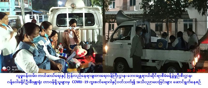 လူမှုဝန်ထမ်း၊ ကယ်ဆယ်ရေးနှင့် ပြန်လည်နေရာချထားရေးဝန်ကြီးဌာန၊ ဘေးအန္တရာယ်ဆိုင်ရာစီမံ ခန့်ခွဲမှုဉီးစီးဌာန၊ ဂန့်ဂေါခရိုင်ဦးစီးမှူးရုံးမှ တာဝန်ရှိသူများသည် လူမှုဝန်ထမ်းဦးစီးဌာနဖြင့်ပူးပေါင်း၍ ဂန့်ဂေါခရိုင်၊ ဂန့်ဂေါမြို့၊ စည်ပင်သာယာရပ်ကွက်၊ မြို့မရပ်ကွက်၊ ကျောရပ်ကွက်၊မြောက်ကုန်းရပ်ကွက် များသို့ (၃၁-၃-၂၀၂၀) ရက်နေ့ (၁၈:၀၀) နာရီမှ (၂၀:၀၀) နာရီအချိန်ထိ COVID-19 ရောဂါကူးစက် ပြန့်နှံ့မှုများမဖြစ်ပွားစေရန်အတွက် သိရှိလိုက်နာဆောင်ရွက်ရန်အချက်များကို ပြည်သူများသို့ အသိပညာ ပေး လှည့်လည်နှိုးဆော်ခြင်းများကို ဆောင်ရွက်ခဲ့ပါကြောင်း သတင်းရရှိပါသည်။