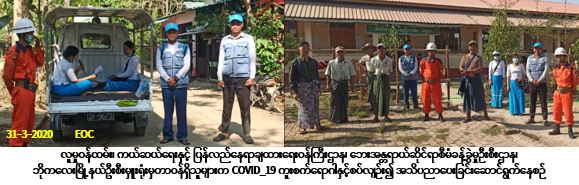 လူမှုဝန်ထမ်း၊ ကယ်ဆယ်ရေးနှင့် ပြန်လည်နေရာချထားရေးဝန်ကြီးဌာန၊ ဘေးအန္တရာယ်ဆိုင်ရာစီမံခန့်ခွဲမှုဉီးစီးဌာန၊ ဘိုကလေးမြို့နယ်ဦးစီးမှူးရုံးမှတာဝန်ရှိသူများသည် (၁-၄-၂၀၂၀) ရက်နေ့၊ (၀၈:၃၀)နာရီအချိန်တွင် ဘိုကလေး မြို့နယ်၊ စက်ဆန်းကျေးရွာအုပ်စု၊ စက်ဆန်းကျေးရွာ၌လည်းကောင်း၊ (၁၂:၀၀)နာရီအချိန်တွင် အောင်ချမ်းသာကျေးရွာ၌လည်းကောင်း၊ (၁၄:၀၀)နာရီအချိန်တွင် အစိကြီးကျေးရွာ၌လည်းကောင်း၊ (၁၆:၀၀)နာရီအချိန်တွင် အစိလေးကျေးရွာ၌လည်းကောင်း COVID-19 ကူးစက်ရောဂါနှင့်စပ်လျဉ်း၍ ဆောင်ရန်/ရှောင်ရန်အချက်များကို လူမှုဝန်ထမ်းဦးစီးဌာနမှတာဝန်ရှိသူများ၊ မီးသတ်ဦးစီးဌာနမှ တာဝန်ရှိသူများ၊ ကျေးရွာရှိအုပ်ချုပ်ရေးမှူး၊ ရပ်မိရပ်ဖများနှင့်အတူ အသိပညာပေးခြင်းဆောင်ရွက်ခဲ့ပါကြောင်း သတင်းရရှိပါသည်။