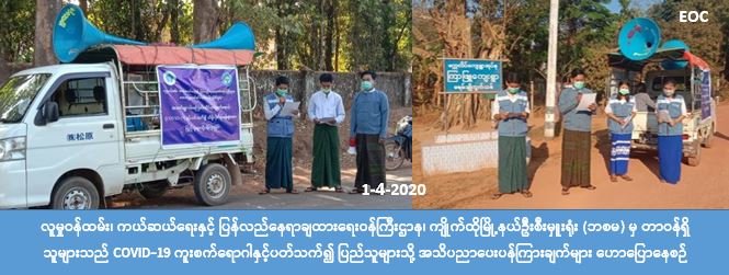 လူမှုဝန်ထမ်း၊ ကယ်ဆယ်ရေးနှင့် ပြန်လည်နေရာချထားရေးဝန်ကြီးဌာန၊ ဘေးအန္တရာယ်ဆိုင်ရာ စီမံခန့်ခွဲမှုဦးစီးဌာန၊ ကျိုက်ထိုမြို့နယ်ဦးစီးမှူးရုံးမှ တာဝန်ရှိသူများသည် (၁-၄-၂၀၂၀)ရက်နေ့ (၁၄:၀၀) နာရီအချိန်မှ (၁၈:၀၀) နာရီအချိန်ထိ သထုံခရိုင်၊ ကျိုက်ထိုမြို့နယ်၊ တောင်သူစု ရပ်ကွက်၊ ကျိုက်ပိကျေးရွာနှင့် ကြာဖြူကျေးရွာအတွင်းရှိ လမ်းဆုံလမ်းခွများနှင့် လူစည်ကားရာ နေရာများတွင် COVID -19 ကူးစက်ရောဂါနှင့်ပတ်သက်၍ ကြိုတင်ကာကွယ် ထိန်းချုပ်နိုင်ရန် ပြည်သူသို့ အသိပညာပေး ပန်ကြားချက်များအား လှည့်လည်အသိပေး ကြေငြာခြင်းများ ဆောင်ရွက်ခဲ့ပါကြောင်း သိရှိရပါသည်။