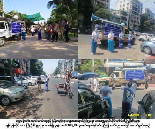 လူမှုဝန်ထမ်း၊ ကယ်ဆယ်ရေးနှင့် ပြန်လည်နေရာချထားရေးဝန်ကြီးဌာန၊ ဘေးအန္တရာယ်ဆိုင်ရာစီမံခန့်ခွဲမှုဉီးစီးဌာန၊ ရန်ကုန်တိုင်းဒေသကြီးဦးစီးမှူးရုံးမှတာဝန်ရှိသူများသည် တိုင်းဒေသကြီးလူမှုဝန်ထမ်းဦးစီးဌာနမှူးရုံး၊ ကျန်းမာရေးဌာန၊ မီးသတ်ဦးစီးဌာန၊ အထွေထွေအုပ်ချုပ်ရေးဦးစီးဌာနတို့မှတာဝန်ရှိသူများ၊ မုဒိတာပရဟိတအသင်းမှလူငယ်များနှင့် ပူးပေါင်း၍ (၁-၄-၂၀၂၀) ရက်နေ့တွင် ရန်ကုန်တောင်ပိုင်းခရိုင်၊ ကွမ်းခြံကုန်းမြို့နယ်၊ စံပြရပ်ကွက်၊ စျေးပိုင်းရပ်ကွက်၊ တောင်ဘက်ပိုင်းရပ်ကွက်များ၌လည်းကောင်း၊ ရန်ကုန်အနောက်ပိုင်းခရိုင်၊ ကြည့်မြင်တိုင်မြို့နယ်၊ မကျီးတန်းတောင်အရှေ့ရပ်ကွက်၊ စိန်ပန်းပင်လမ်းရပ်ကွက်၊ စျေးကြီးရပ်ကွက်၊ အိုးဘိုရပ်ကွက်၊ ထီးလေးရပ်ကွက်၊ ဘောဂရပ်ကွက်၊ ပန်းလှိုင်ရပ်ကွက်၊ ဆေးအိုးတန်းရပ်ကွက်များ၌လည်းကောင်း COVID-19 ကူးစက်ရောဂါနှင့်စပ်လျဉ်း၍ ဆောင်ရန်/ရှောင်ရန်အချက်များအသိပညာပေးခြင်း၊ ကျန်းမာရေးနှင့်အားကစား ဝန်ကြီးဌာနမှထုတ်ပြန်ထားသော လက်ကမ်းစာစောင်များ၊ ဗီနိုင်းများဖြန့်ဝေခြင်းတို့ဆောင်ရွက်ခဲ့ပါကြောင်း သတင်းရရှိိပါသည်။