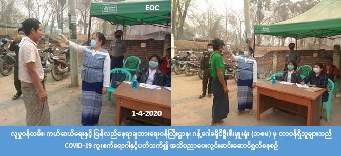 လူမှုဝန်ထမ်း၊ ကယ်ဆယ်ရေးနှင့် ပြန်လည်နေရာချ ထားရေးဝန်ကြီးဌာန၊ ဘေးအန္တရာယ်ဆိုင်ရာ စီမံခန့်ခွဲမှုဦးစီးဌာန၊ ဂန့်ဂေါခရိုင်ဦးစီးမှူးရုံးမှ တာဝန်ရှိသူများသည် မြို့နယ်အထွေထွေအုပ်ချုပ် ရေးဦးစီးဌာန၊ဌာနဆိုင်ရာများမှ တာဝန်ရှိသူများဖြင့်ပူးပေါင်း၍ (၁-၄-၂၀၂၀)ရက်နေ့ (ဝ၈:၃၀) နာရီမှ (၁၇:၃၀) နာရီအချိန်ထိ လတ်တလောနိုင်ငံအသီးသီးတွင် ကူး စက်ပြန့်ပွါး လျက်ရှိသည့် COVID-19 ရောဂါကြိုတင်ကာကွယ်ရေးအတွက်ဂန့်ဂေါခရိုင်အတွင်းယာဉ် ဝင်/ထွက်အတွက် စီးနင်းလိုက်ပါလာသော ခရီးသည်များအား ကိုယ်အပူချိန်တိုင်းထွာပေးခြင်းနှင့် ပြည်တွင်း/ပမှ ပြန်လာသူများအား စာရင်းပြုစုခြင်း တို့ကို ဆောင်ရွက်ခဲ့ကြောင်း သိရှိရပါသည်။