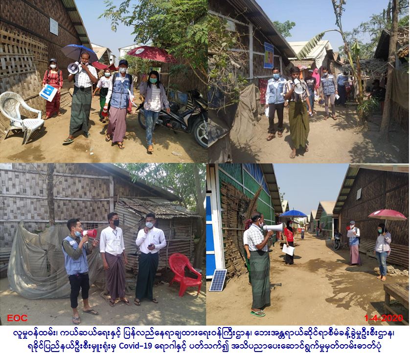 လူမှုဝန်ထမ်း၊ ကယ်ဆယ်ရေးနှင့်ပြန်လည်နေရာချထားရေးဝန်ကြီးဌာန၊ ဘေးအန္တရာယ်ဆိုင်ရာစီမံခန့်ခွဲမှုဦးစီးဌာန၊ ရခိုင်ပြည်နယ်ဦးစီးမှူးရုံးမှ တာဝန်ရှိသူများသည် (၁-၄-၂၀၂၀) ရက်၊ (၀၉:၀၀) နာရီတွင် စစ်တွေမြို့၊ အုန်းတောကြီးတောင်နှင့် အုန်းတောကြီး မြောက် IDP စခန်းများ၌ စခန်းနေပြည်သူများအတွက် Covid-19 ကူးဆက်ရောဂါနှင့်ပတ်သက်ပြီး ဆောင်ရန်၊ ရှောင်ရန်များအား စခန်းကော်မတီဝင်များနှင့်ပူးပေါင်း၍ အသိပေးလုပ်ငန်းများဆောင်ရွက်ခဲ့ပါကြောင်း သတင်းရရှိပါသည်။