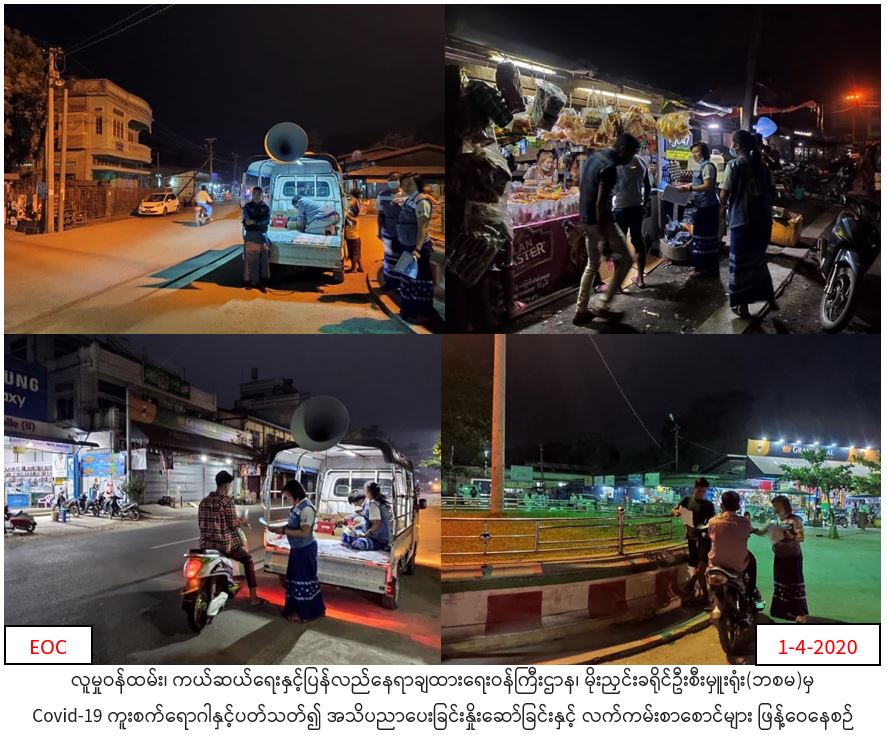 လူမှုဝန်ထမ်း၊ ကယ်ဆယ်ရေးနှင့်ပြန်လည်နေရာချထားရေးဝန်ကြီးဌာန၊ ဘေးအန္တရာယ်ဆိုင်ရာစီမံခန့်ခွဲမှုဦးစီးဌာန၊ မိုးညှင်းခရိုင်ဦးစီးမှူးရုံးမှ တာဝန်ရှိသူများသည် မေတ္တာမွန်လူမှုကူညီရေးအသင်းနှင့်ပူးပေါင်းပြီး (၁-၄-၂၀၂၀)ရက်နေ့ (၁၈:၀၀)အချိန်၌ မိုးညှင်းမြို့၊ နားခါရပ်ကွက်နှင့် အုတ်ကျင်းရပ်ကွက်တို့တွင် လှည့်လည်ပြီး COVID-19ကူးစက်ရောဂါနှင့်ပတ်သက်၍ ပြည်သူလူထုသိရှိစေရန်အတွက် ဆောင်ရန်/ရှောင်ရန်အချက်များ၊ လိုက်နာရမည့်အချက်များအား အသိပညာပေးဆော်သြခြင်းနှင့် လက်ကမ်းစာစောင်များဖြန့်ဝေခြင်းတို့ဆောင်ရွက်ခဲ့ကြောင်း သတင်းရရှိပါသည်။