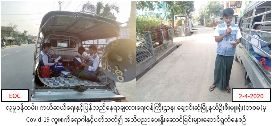 လူမှုဝန်ထမ်း၊ ကယ်ဆယ်ရေးနှင့်ပြန်လည်နေရာချထားရေးဝန်ကြီးဌာန၊ ဘေးအန္တရာယ်ဆိုင်ရာစီမံခန့်ခွဲမှုဦးစီးဌာန၊ ချောင်းဆုံမြို့နယ်ဦးစီးမှူးရုံးမှ တာဝန်ရှိသူများသည် (၂-၄-၂၀၂၀) ရက်နေ့ (၀၈:၃၀) နာရီအချိန်မှ (၁ဝ:၃၀) နာရီအချိန်ထိ မွန်ပြည်နယ်၊ မော်လမြိုင်ခရိုင်၊ ချောင်းဆုံမြို့နယ်၊ ချောင်းဆုံအရှေ့ရပ်ကွက်နှင့် ချောင်းဆုံအနောက်ရပ်ကွက်အတွင်းရှိ လမ်းဆုံလမ်းခွများနှင့် လူစည်ကားရာနေရာများတွင် COVID -19 ကူးစက်ရောဂါနှင့်ပတ်သက်၍ ကြိုတင်ကာကွယ် ထိန်းချုပ်နိုင်ရန် ပြည်သူသို့ အသိပညာပေး ပန်ကြားချက်များအား အသံချဲ့စက်များဖြင့် လှည့်လည်အသိပေး ဟောပြောခြင်းများ ဆောင်ရွက်ခဲ့ကြောင်း သတင်းရရှိပါသည်။
