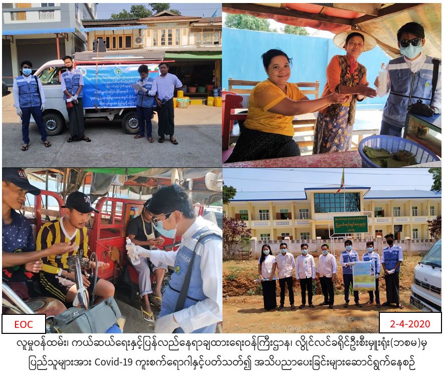လူမှုဝန်ထမ်း၊ ကယ်ဆယ်ရေးနှင့်ပြန်လည်နေရာချထားရေးဝန်ကြီးဌာန၊ ဘေးအန္တရာယ်ဆိုင်ရာစီမံခန့်ခွဲမှုဦးစီးဌာန၊ လွိုင်လင်ခရိုင်ဦးစီးမှူးရုံးမှ တာဝန်ရှိသူများသည် လွိုင်လင်မြို့ ကြက်ခြေနီအဖွဲ့နှင့်ပူးပေါင်း၍ အသက်ရှူလမ်းကြောင်းဆိုင်ရာရောဂါ (COVID-19 )အသိပညာပေးခြင်းကို (၂-၄-၂၀၂၀) ရက်နေ့ (၉:၀၀) မှ (၁၂:၃၀) ထိ လွိုင်လင်ခရိုင်၊ နမ့်စန်မြို့l မြို့မစျေး ရပ်ကွက်(၁)၊ (၂)၊ (၃)၊ (၄)များကို COVID-19 အသိပညာပေးခြင်းကို လှည့်လည်ဟောပြောခဲ့ကြောင်း သတင်းရရှိပါသည်။