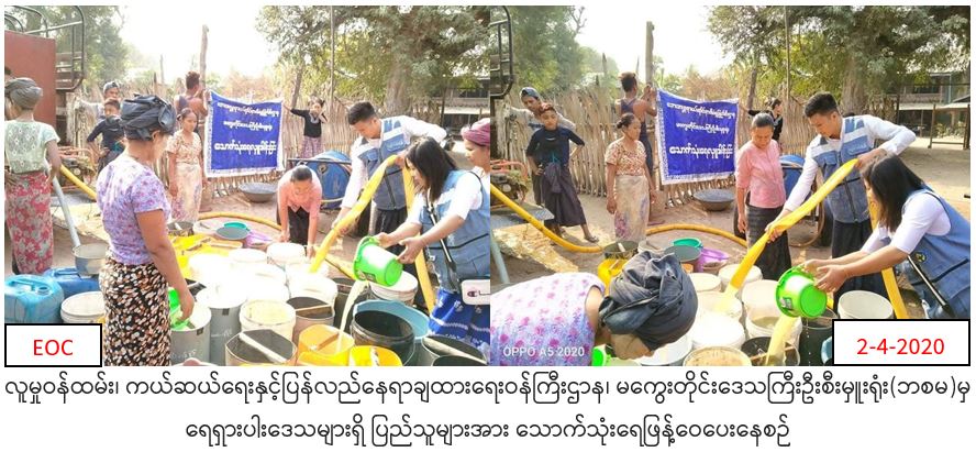 လူမှုဝန်ထမ်း၊ ကယ်ဆယ်ရေးနှင့်ပြန်လည်နေရာချထားရေး၀န်ကြီးဌာန၊ ဘေးအန္တရာယ်ဆိုင်ရာစီမံခန့်ခွဲမှုဦးစီးဌာန၊ မကွေးတိုင်းဒေသကြီးဦးစီးမှူးရုံးမှ တာဝန်ရှိသူများသည် သောက်သုံးရေခက်ခဲသော မကွေးမြို့နယ် ၊ကြာကန်ကျေးရွာအုပ်စု၊ ကြာကန်ကျေးရွာ(အရှေ့ပိုင်း)၊ ဦးကျော်စိန်(တဲတိုက်)နှင့် ချောင်းဆင်း(တဲတိုက်)ရှိ အိမ်ခြေ (၁၀၇) လုံး၊ အိမ်ထောင် စု(၁၂၆) စု၊ လူဦးရေ (၅၄၈) ဦးတို့အတွက် သောက်သုံးရေဂါလံ (၆၀၀၀) အား ( ၂- ၄-၂၀၂၀) ရက်နေ့ ( ၁၁ : ၀၀ ) နာရီအချိန်တွင် သွားရောက်ဖြန့်ဝေပေးခဲ့ပါ ကြောင်း သတင်းရရှိပါသည်။