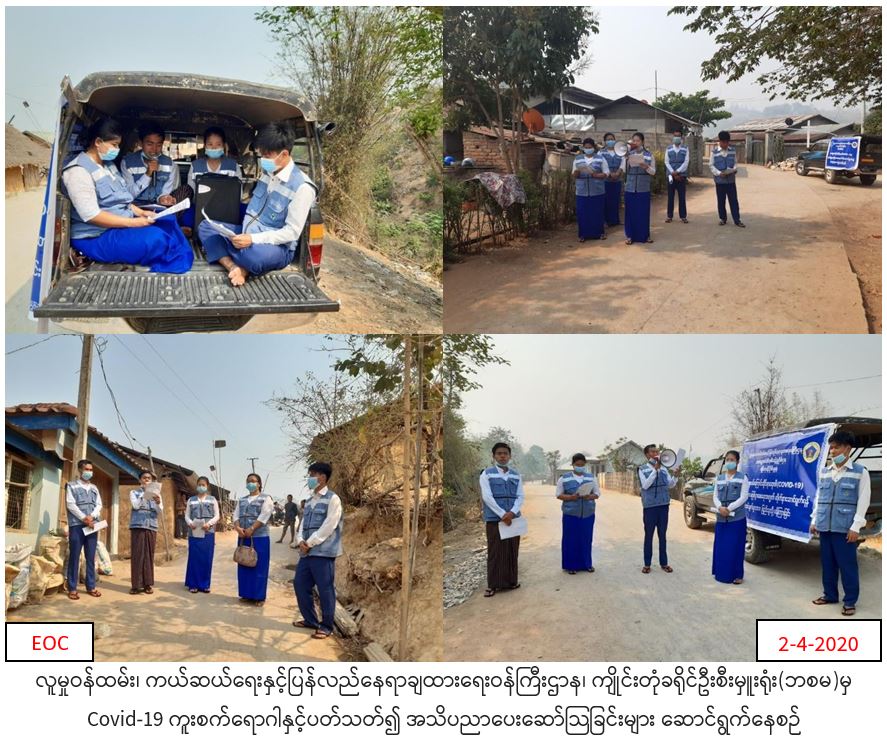 လူမှုဝန်ထမ်း၊ ကယ်ဆယ်ရေးနှင့်ပြန်လည်နေရာချထားရေးဝန်ကြီးဌာန၊ ဘေးအန္တရာယ်ဆိုင်ရာစီမံခန့်ခွဲမှုဦးစီးဌာန၊ ကျိုင်းတုံခရိုင်ဦးစီးမှူးရုံး မှ တာ၀န်ရှိသူများသည် (၂-၄-၂၀၂၀)ရက်နေ့၌ လတ်တစ်လော နိုင်ငံအသီးသီးတွင် ကူးစက်ပြန့်ပွားလျက်ရှိသော COVID – 19 ကူးစက်ရောဂါကြိုတင်ကာကွယ်ထိန်းချုပ်နိုင်ရေးအတွက် ကျိုင်းတုံမြို့၊ မိုင်းဇင်းကျေးရွာအုပ်စု၊ နောင်နွန်းကျေးရွာနှင့် ပန်ဟွန်းကျေးရွာတို့တွင် COVID-19 ရောဂါ ကူးစက်ပြန့်နှံ့မှုမဖြစ်ပွားစေရန် သိရှိလိုက်နာဆောင်ရွက်ရမည့် အချက်များကို အသိပညာပေးဟောပြောဆောင်ရွက်ခဲ့ကြောင်း သတင်းရရှိပါသည်။