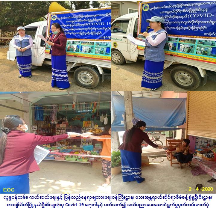 လူမှုဝန်ထမ်း၊ ကယ်ဆယ်ရေးနှင့်ပြန်လည်နေရာချထားရေးဝန်ကြီးဌာန၊ ဘေးအန္တရာယ်ဆိုင်ရာစီမံခန့်ခွဲမှုဦးစီးဌာန၊ တာချီလိတ် မြို့နယ်ဦးစီးမှူးရုံးမှ တာဝန်ရှိသူများသည် (၂-၄-၂၀၂၀)ရက်နေ့တွင် လူမှုဝန်ထမ်း၊ကယ်ဆယ်ရေးနှင့် ပြန်လည်နေရာချထားရေး ဝန်ကြီးဌာန၊ ဘေးအန္တရာယ်ဆိုင်ရာစီမံခန့်ခွဲမှုဦးစီးဌာန၊ တာချီလိတ်မြို့နယ်ဦးစီးမှုးရုံးမှတာဝန်ရှိသူများသည် အလင်းရောင် ပရဟိတလူမှုကူညီရေးအသင်းနှင့်ပူးပေါင်း၍ တာချီလိတ်မြို့နယ်၊ မိုင်းဖုန်း(က)နှင့် (ခ)ကျေးရွာကျေးရွာအတွင်းရှိ ဝမ်ပုံကျေးရွာ၊ ဝမ်တုံကျေးရွာ၊ နမ့်ယုတ်ကျေးရွာ စသည့်ကျေးရွာ၌ ovid-19ရောဂါ ကူးစက်ပျံ့ပွားမှုလျော့နည်းစေရေးနှင့် ကာကွယ်ထိန်းချုပ် နိုင်ရေးအတွက် ပြည်သူထံ အသိပေးပန်ကြားခြင်းကို အသံချဲ့စက်ကိုအသုံးပြုပြီး ရှမ်းဘာသာ၊ မြန်မာဘာသာဖြင့် လှည့်လည် ဆော်သြခဲ့ပြီး လက်ကမ်းစာစောင်များ ဖြန့်ဝေခဲ့ပါကြောင်း သတင်းရရှိပါသည်။