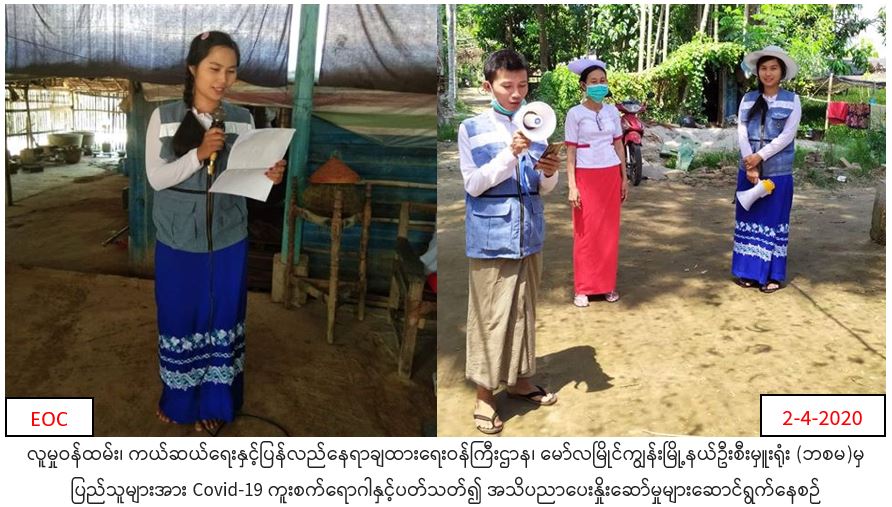လူမှုဝန်ထမ်း၊ ကယ်ဆယ်ရေးနှင့်ပြန်လည်နေရာချထားရေးဝန်ကြီးဌာန၊ ဘေးအန္တရာယ်ဆိုင်ရာစီမံခန့်ခွဲမှုဦးစီးဌာန၊ မော်လမြိုင်ကျွန်းမြို့နယ်ဦးစီးမှူးရုံးမှ တာဝန်ရှိသူများသည် အထွေထွေအုပ်ချုပ်ရေးဦးစီးဌာန၊ ကျေးလက်ကျန်းမာရေးဌာနတို့နှင့် အတူပူးပေါင်း၍ (၂-၄-၂၀၂၀) ရက်နေ့၊ (၀၉း၀၀)နာရီအချိန်မှ (၁၃း၀၀)နာရီအချိန်ထိ မော်လမြိုင်ကျွန်းမြို့နယ်၊ တယ်ချောင်းကျေးရွာအုပ်စုအတွင်း၌ Covid-19 ရောဂါကူးစက်ပျံ့နှံ့မှုမဖြစ်ပွားစေရန် သိရှိလိုက်နာ ဆောင်ရွက်ရမည့်အချက်များကို Hand Speaker ၊ Loud Speaker များဖြင့် ကျေးရွာများအတွင်းလှည့်လှည်၍ အသိပညာပေးနှိုးဆော်များ ဆောင်ရွက်ခဲ့ကြောင်း သတင်းရရှိပါသည်။