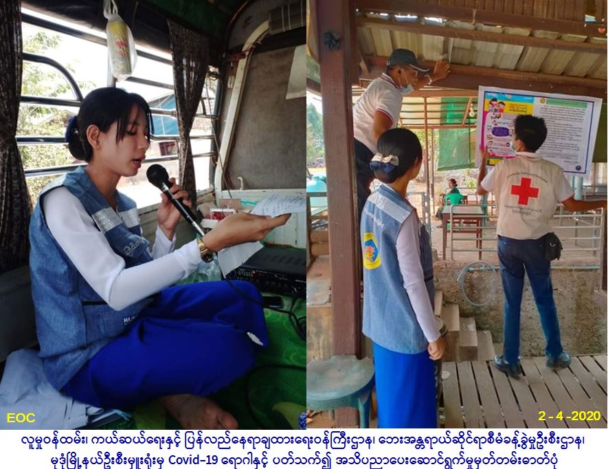 လူမှုဝန်ထမ်း၊ ကယ်ဆယ်ရေးနှင့် ပြန်လည်နေရာချထားရေးဝန်ကြီးဌာန၊ ဘေးအန္တရာယ်ဆိုင်ရာစီမံခန့်ခွဲမှုဦးစီးဌာန၊ မုဒုံမြို့နယ် ဦးစီးမှူးရုံးမှ တာဝန်ရှိသူများသည် (၂-၄-၂၀၂၀) ရက်နေ့ (၁၀:၀၀) နာရီအချိန်မှ (၁၃:၀၀) နာရီအချိန်ထိမွန်ပြည်နယ်၊ မော်လမြိုင် ခရိုင်၊ မုဒုံမြို့နယ်၊ နှီးပဒေါကျေးရွာ၊ ရောင်းဒေါင်းကျေးရွာနှင့် ကွမ်လှာကျေးရွာအတွင်းရှိ လမ်းဆုံလမ်းခွများနှင့် လူစည်ကားရာ နေရာများတွင် COVID -19 ကူးစက်ရောဂါနှင့်ပတ်သက်၍ ကြိုတင်ကာကွယ် ထိန်းချုပ်နိုင်ရန် ပြည်သူသို့ အသိပညာပေး ပန်ကြားချက်များအားလှည့်လည်အသိပေး ကြေငြာခြင်းများဆောင်ရွက်ခဲ့ပါကြောင်း သတင်းရရှိပါသည်။