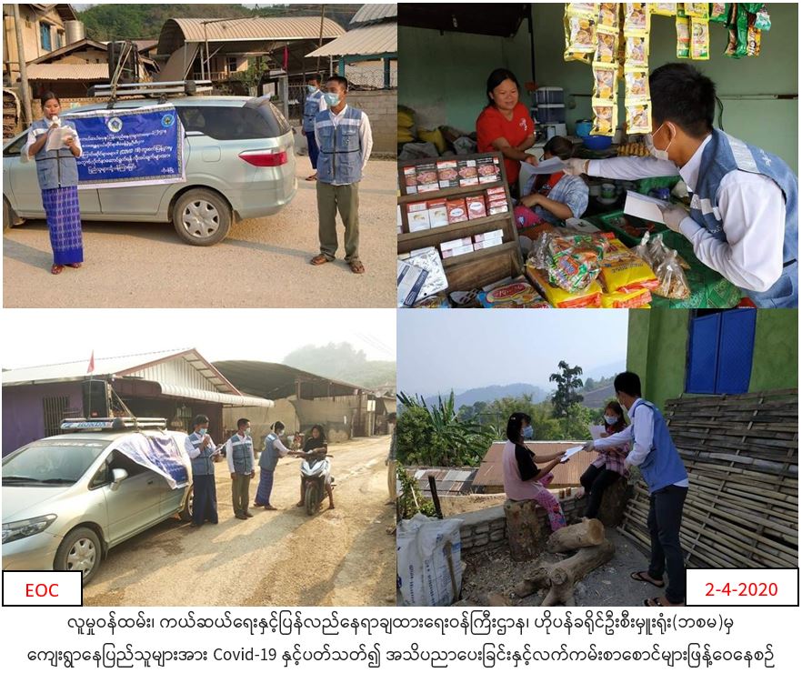 လူမှုဝန်ထမ်း၊ ကယ်ဆယ်ရေးနှင့်ပြန်လည်နေရာချထားရေးဝန်ကြီးဌာန၊ ဘေးအန္တရာယ်ဆိုင်ရာစီမံခန့်ခွဲမှုဦးစီးဌာန ဟိုပန်ခရိုင်ဦးစီးမှူးရုံးမှ တာဝန်ရှိသူများသည် (၂-၄-၂၀၂၀) ရက်နေ့တွင် ဟိုပန်မြို့ ရွှေဝါကျေးရွာ၊ မော်ဟွေ့ကျေးရွာနှင့် ဟင်းနားကျေးရွာတို့၌ Covid-19ရောဂါကူးစက်ပျံ့နှံ့မှုမဖြစ်ပွားစေရန် သိရှိလိုက်နာ ဆောင်ရွက်ရမည့်အချက်များကို အသိပေးဟောပြောခြင်း၊လက်ကမ်းစာစောင်များဖြန့်ဝေခြင်းတို့ပြုလုပ်ခဲ့ကြောင်း သတင်းရရှိပါသည်။