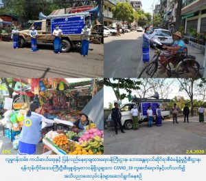 လူမှုဝန်ထမ်း၊ ကယ်ဆယ်ရေးနှင့် ပြန်လည်နေရာချထားရေးဝန်ကြီးဌာန၊ ဘေးအန္တရာယ်ဆိုင်ရာစီမံခန့်ခွဲမှုဦးစီးဌာန၊ ရန်ကုန်တိုင်းဒေသကြီးဦးစီးမှူးရုံးမှတာဝန်ရှိသူများသည် (၂ -၄- ၂၀၂၀) ရက်နေ့တွင် တိုင်းဒေသကြီးလူမှုဝန်ထမ်းဦးစီးဌာနမှူးရုံးမှတာဝန်ရှိသူများနှင့်အတူ ပူးပေါင်း၍ ရန်ကုန်တောင်ပိုင်းခရိုင်၊ ကွမ်းခြံကုန်းမြို့နယ်၊ မြို့မရပ်ကွက်၊ ကံကြီး-မကြီးတန်းရပ်ကွက်၊ မင်းပိုင်းရပ်ကွက်၊ တော်ပလွဲရပ်ကွက်များတွင်လည်းကောင်း၊ ရန်ကုန်အနောက်ပိုင်းခရိုင်၊ အလုံမြို့နယ်၊ ဌာနရပ်ကွက်၊ စောရန်နိုင်ပိုင်မြောက်ရပ်ကွက်၊ စောရန်နိုင်ပိုင်အနောက်ရပ်ကွက်၊ ဆင်မင်းရပ်ကွက်များတွင်လည်းကောင်း Covid-19 အသက်ရှူလမ်းကြောင်းဆိုင်ရာရောဂါနှင့်ပတ်သက်၍ အများပြည်သူများသိရှိလိုက်နာရန် အချက်များအား အသိပညာပေးပန်ကြားခြင်းနှင့် ကျန်းမာရေးနှင့်အားကစားဝန်ကြီးဌာနမှ ထုတ်ပြန်ထားသော လက်ကမ်းစာစောင်များအား ရပ်ကွက်များအတွင်းကြေညာခြင်း၊ ဖြန်ဝေခြင်းစသည့် ပြည်သူအသိပညာပေးလုပ်ငန်းများကို သက်ဆိုင်ရာကျန်းမာရေးဦးစီးဌာန၊ မီးသတ်ဦးစီးဌာန၊ အထွေထွေအုပ်ချုပ်ရေးဦးစီးဌာနတို့မှတာဝန်ရှိသူများ၊ မုဒိတာပရဟိ တအသင်းမှလူငယ်များနှင့်အတူ ဆောင်ရွက်ခဲ့ပါကြောင်း သတင်းရရှိပါသည်။
