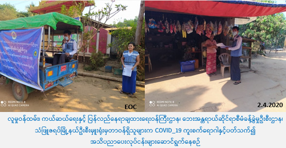 လူမှုဝန်ထမ်း၊ ကယ်ဆယ်ရေးနှင့် ပြန်လည်နေရာချထားရေးဝန်ကြီးဌာန၊ ဘေးအန္တရာယ်ဆိုင်ရာစီမံခန့်ခွဲမှုဉီးစီးဌာန၊ သံဖြူဇရပ်မြို့နယ်ဦးစီးမှူးရုံးမှ တာဝန်ရှိသူများသည် (၂-၄-၂၀၂၀) ရက်နေ့ (၁၄:၀၀) နာရီအချိန်မှ (၁၇:၃၀) နာရီအချိန်အထိ မွန်ပြည်နယ်၊ မော်လမြိုင်ခရိုင်၊ သံဖြူဇရပ်မြို့နယ်၊ ဝဲဝင်ကရာကျေးရွာ၊ ဝဲကလိကျေးရွာ၊ ဝဲရက်ကျေးရွာနှင့် ဝယ်သွန်ချောင် ကျေးရွာများသို့သွားရောက်၍ COVID-19 ကူးစက်ရောဂါနှင့်ပတ်သက်၍ ကြိုတင်ကာကွယ် ထိန်းချုပ်နိုင်ရန် ပြည်သူသို့အသိပညာပေးပန်ကြားချက်များအား လှည့်လည်ကြေငြာခြင်းနှင့် အသိပညာပေးလက်ကမ်းစောင်များအား ဖြန့်ဝေပေးခြင်းတို့ကို ဆောင်ရွက်ခဲ့ပါကြောင်း သတင်းရရှိပါသည်။