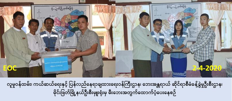 လူမှုဝန်ထမ်း၊ ကယ်ဆယ်ရေးနှင့် ပြန်လည်နေရာချထားရေးဝန်ကြီးဌာန၊ ဘေးအန္တရာယ် ဆိုင်ရာစီမံခန့်ခွဲမှုဦးစီးဌာန၊ မိုင်းဖြတ်မြို့နယ်ဦးစီးမှူးရုံးမှ တာဝန်ရှိသူများသည် (၃၁-၃-၂၀၂၀) ရက်နေ့၊ (၁၅ : ၃၀)နာရီအချိန်တွင် တာချီလိတ်ခရိုင်၊ မိုင်းဖြတ်မြို့နယ်၊ မွန်ကာကျောင်းအုပ်စု၊ ဟိုပေါ့ (၂) ကျေးရွာ၌ ဖြစ်ပွားခဲ့သော မီးဘေးကြောင့် နေအိမ်(၂) လုံး၊ အိမ်ထောင်စု (၂) စု ၊လူဦးရေ (၁၁) ဦးမီးဘေးသင့်ခဲ့ရာ သက်ကယ်မိုး၊ ထရံကာနေအိမ်(၂)လုံးအတွက် အိမ်ဆောက်ပစ္စည်းဖိုး ထောက် ပံ့ငွေ (၂၀၀၀၀၀/-) ကျပ်၊ ဘေးသင့်လူဦးရေ (၁၁)ဦးအတွက် ဆန်ရိက္ခာ(၇) ရက်စာဖိုးထောက်ပံ့ငွေ (၂၃၁၀၀/-) ကျပ်၊ စုစုပေါင်းထောက်ပံ့ငွေ (၂၂၃၁၀၀) ကျပ်နှင့် ကယ်ဆယ်ရေးပစ္စည်း (၂၂) မျိုး၊ (၂) အိမ် ထောင်စုစာတို့ကို (၂-၄-၂၀၂၀) ရက်နေ့၊ (၁၆ : ၀၀) နာရီအချိန်တွင် မြို့နယ်ထွေအုပ်ရုံး၌ မြို့နယ်အုပ်ချုပ်ရေးမှူး၊ မြို့နယ်ပြန်ဆက်ဦးစီးမှူးတို့နှင့် အတူ ဘေးသင့်ပြည်သူတို့အား ထောက်ပံ့ပေးအပ်ခဲ့ကြောင်းသတင်းရရှိပါသည်။