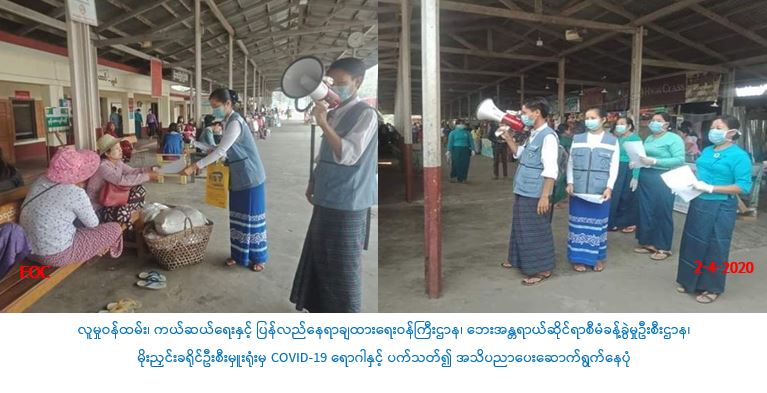 လူမှုဝန်ထမ်း၊ ကယ်ဆယ်ရေးနှင့် ပြန်လည်နေရာချထားရေးဝန်ကြီးဌာန၊ ဘေးအန္တရာယ်ဆိုင်ရာစီမံခန့်ခွဲမှုဦးစီးဌာန၊ မိုးညှင်းခရိုင်ဦးစီးမှူးရုံးမှ တာဝန်ရှိသူများသည် (၂-၄-၂၀၂၀)ရက်နေ့ (၁၃:၃၀)အချိန်မှ(၁၇:၃၀)ချိန်ထိ မိုးကောင်းမြို့၊စျေးကုန်းရပ်ကွက်နှင့် နတ်ကြီးကုန်းရပ်ကွက်တို့တွင် COVID-19 ကူးစက်ရောဂါနှင့်ပတ်သက်၍ ဆောင်ရန်/ရှောင်ရန် အချက်များ၊ လိုက်နာရမည့်အချက်များ အသိပညာပေးနှိုးဆော်ခြင်းနှင့် လက်ကမ်းစာစောင်များဝေငှခြင်းတို့ ဆောင်ရွက်ခဲ့ပါကြောင်း သတင်းရရှိပါသည်။
