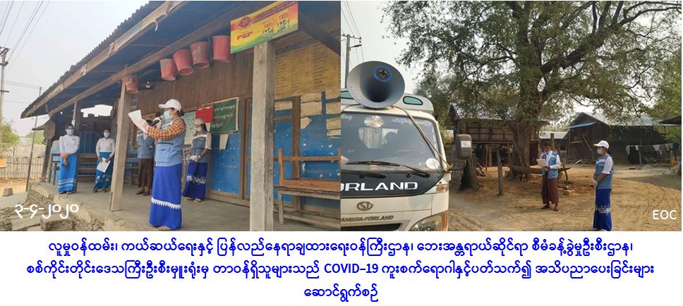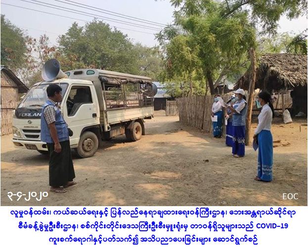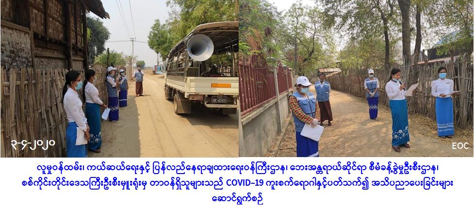လူမှုဝန်ထမ်း၊ ကယ်ဆယ်ရေးနှင့် ပြန်လည်နေရာချထားရေးဝန်ကြီးဌာန၊ ဘေးအန္တရာယ်ဆိုင်ရာစီမံ ခန့်ခွဲမှုဦးစီးဌာန၊ စစ်ကိုင်းတိုင်းဒေသကြီးဦးစီးမှူးရုံးမှ တာဝန်ရှိသူများသည် (၃-၄-၂၀၂၀) ရက်နေ့တွင် မုံရွာမြို့နယ်အတွင်းရှိ ကိုင်းတောကျေးရွာ၊ သပြေပင်စုကျေးရွာ၊ ပလ္လင်ကျေးရွာ၊ ဇီးကျွန်းကျေးရွာ၊ တောင်မတောကျေးရွာ၊ ညောင်ပင်ကျေးရွာ၊ အောက်စိန်တောကျေးရွာနှင့် သဲသာကျေးရွာ စုစုပေါင်း ကျေးရွာ (၈) ရွာနေ မိဘပြည်သူများအား COVID-19 ရောဂါ ကူးစက်ပြန့်နှံ့မှုမပြန့်ပွားစေရေးအတွက် ဆောင်ရန် ရှောင်ရန် အသိပညာပေး နှိုးဆော်ခြင်းများကို ဆောင်ရွက်ခဲ့ကြောင်း သတင်းရရှိပါသည်။