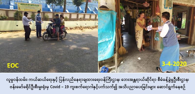 လူမှုဝန်ထမ်း၊ ကယ်ဆယ်ရေးနှင့် ပြန်လည်နေရာချထားရေးဝန်ကြီးဌာန၊ ဘေးအန္တရာယ်ဆိုင်ရာ စီမံခန့်ခွဲမှုဦးစီးဌာန၊ ဗန်းမော်ခရိုင်ဦးစီးမှုးရုံးမှ တာဝန်ရှိသူများသည် (၃-၄-၂၀၂၀)ရက်နေ့တွင် ဗန်းမော်မြို့နယ်ရှိ မံရွက်ကျေးရွာအတွင်းသို့ သုညသုခပရဟိတလူငယ်အသင်းနှင့် အတူ လှည့်လည်၍ အသက်ရှူလမ်းကြောင်း ဆိုင်ရာ ကူးစက်ရောဂါ COVID- 19 ကာကွယ်၊ တားဆီး ထိန်းချုပ်ကုသရေးဆိုင်ရာ ပြည်သူသို့ ပန်ကြားချက်အသိပညာပေးမှုအား hand speakerများဖြင့် လှည့်လည်ဟောပြောခြင်းနှင့် လက်ကမ်းစာစောင်ဖြန့်ဝေခြင်းများ ဆောင်ရွက်ခဲ့ကြောင်း သတင်းရရှိပါသည်။
