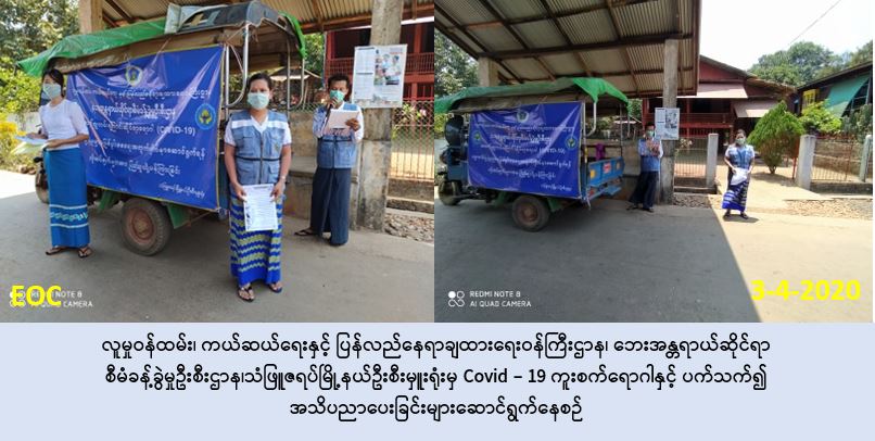 လူမှုဝန်ထမ်း၊ ကယ်ဆယ်ရေးနှင့် ပြန်လည်နေရာချထားရေးဝန်ကြီးဌာန၊ ဘေးအန္တရာယ်ဆိုင်ရာ စီမံခန့်ခွဲမှုဉီးစီးဌာန၊ သံဖြူဇရပ်မြို့နယ်ဦးစီးမှူးရုံးမှ တာဝန်ရှိသူများသည် (၃-၄-၂၀၂၀) ရက်နေ့ ၊ (၁၀:၀၀) နာရီအချိန်မှ (၁၃:၃၀) နာရီအချိန်ထိမွန်ပြည်နယ်၊ မော်လမြိုင်ခရိုင်၊ သံဖြူဇရပ်မြို့နယ်၊ ပဒံငံလေးကျေးရွာ၊ ပဒံငံကြီးကျေးရွာ၊ ကွမ်သတ်ကျေးရွာ၊ ကျုံကဒါတ်ကျေးရွာ၊ တောင်ဖလု ကျေးရွာနှင့် ဝါခရူကျေးရွာများသို့ သွားရောက်၍ COVID -19 ကူးစက်ရောဂါနှင့်ပတ်သက်၍ ကြိုတင်ကာကွယ်ထိန်းချုပ်နိုင်ရန် ပြည်သူသို့ အသိပညာပေး ပန်ကြားချက်များအား လှည့်လည်အသိပေး ကြေငြာခြင်းများနှင့် COVID – 19 ရောဂါ အသိပညာပေးလက်ကမ်း စောင်များအား ဖြန့်ဝေပေးခြင်းများကို ဆောင်ရွက်ခဲ့ပါကြောင်း သတင်းရရှိပါသည်။