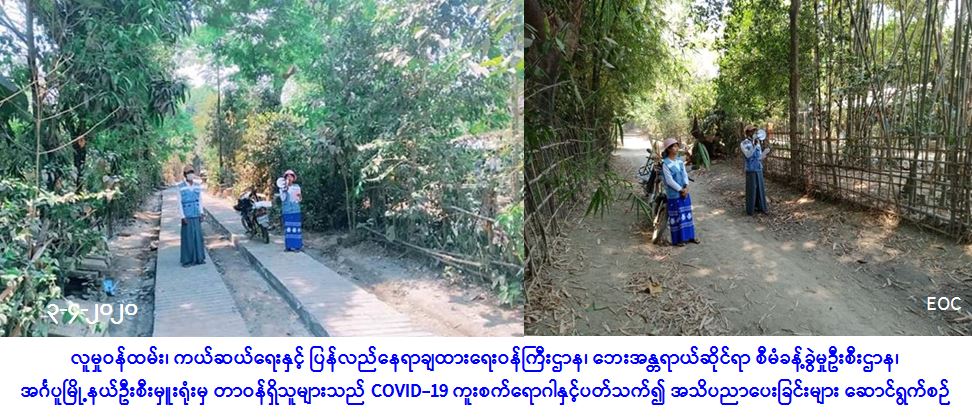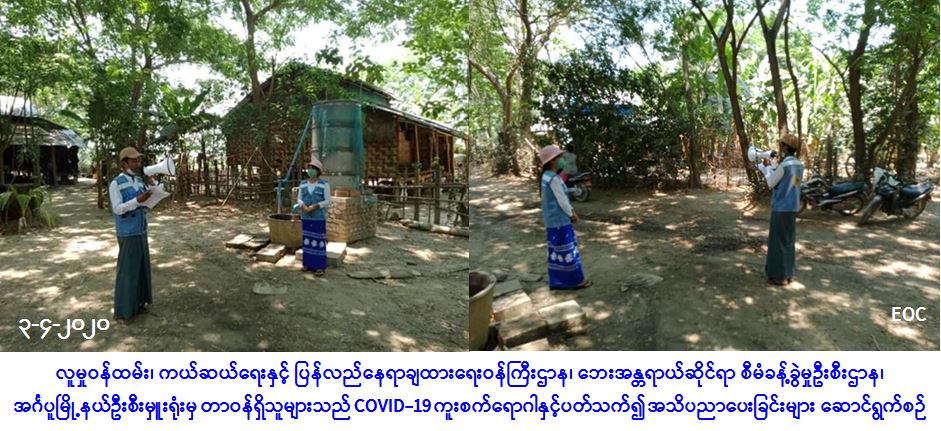 လူမှုဝန်ထမ်း၊ ကယ်ဆယ်ရေးနှင့် ပြန်လည်နေရာချထားရေးဝန်ကြီးဌာန၊ ဘေးအန္တရာယ်ဆိုင်ရာစီမံ ခန့်ခွဲမှုဦးစီးဌာန၊ အင်္ဂပူမြို့နယ်ဦးစီးမှူးရုံးမှ တာဝန်ရှိသူများသည် အထွေထွေအုပ်ချုပ်ရေးဦးစီးဌာနနှင့်ပူးပေါင်း၍ (၃-၄-၂၀၂၀) ရက်နေ့တွင် ကံဘက်အုပ်စု သာယာကုန်းကျေးရွာအတွင်းရှိ ပြည်သူများအား COVID-19 ကူးစက်ရောဂါနှင့်ပတ်သက်၍ ကာကွယ် တားဆီး ထိန်းချုပ် ကုသရေးဆိုင်ရာ ပြည်သူအသိပညာပေးပန်ကြားချက်များ လှည့်လည်ဟောပြောခြင်း၊ လက်ကမ်းစာစောင်များ ဝေငှခြင်းတို့ ဆောင်ရွက်ခဲ့ကြောင်း သတင်းရရှိပါသည်။