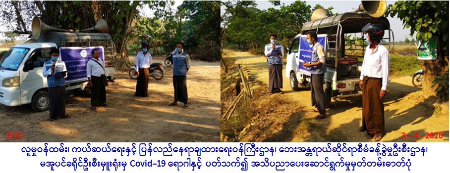 လူမှုဝန်ထမ်း၊ ကယ်ဆယ်ရေးနှင့် ပြန်လည်နေရာချထားရေးဝန်ကြီးဌာန၊ ဘေးအန္တရာယ်ဆိုင်ရာစီမံခန့်ခွဲမှုဦးစီးဌာန၊ မအူပင်ခရိုင် ဦးစီးမှူးရုံးမှ တာဝန်ရှိသူများသည် (၃-၄-၂၀၂၀) ရက်နေ့တွင် ပန်းတနော်မြို့နယ်၊ ခတ္တိယအထက်ကျေးရွာအုပ်စုရှိ ကျေးရွာခွဲ (၈) ရွာ၌ Covid-19 ရောဂါ ကူးစက်ပျံ့ပွားမှုများ မဖြစ်ပွားစေရန်တွက် အများပြည်သူသိရှိလိုက်နာဆောင်ရွက်ရန်အချက်များအား လှည့်လည်ဟောပြောခြင်းများ ဆောင်ရွက်ခဲ့ပါကြောင်း သတင်းရရှိပါသည်။