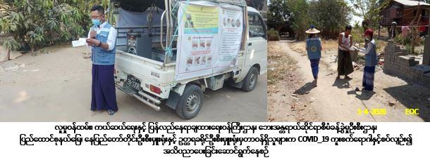 လူမှုဝန်ထမ်း၊ ကယ်ဆယ်ရေးနှင့် ပြန်လည်နေရာချထားရေးဝန်ကြီးဌာန၊ ဘေးအန္တရာယ်ဆိုင်ရာစီမံခန့်ခွဲမှုဉီးစီးဌာန၊ ပြည်ထောင်စုနယ်မြေ၊ နေပြည်တော်တိုင်းဦးစီးမှူးရုံးနှင့် ဥတ္တရခရိုင်ဦးစီးမှူးရုံးမှတာဝန်ရှိသူများသည် (၃-၄-၂၀၂၀) ရက်နေ့၊ (၁၃:၀၀) နာရီအချိန်မှ (၁၇:၀၀) နာရီအချိန်အထိ ပုဗ္ဗသီရိမြို့နယ်၊ ဘဲကုန်း(တောင်၊မြောက်)ကျေးရွာ၊ သစ်ယာကုန်းကျေးရွာ၌ COVID-19 ကူးစက်ရောဂါနှင့်စပ်လျဉ်း၍ ဆောင်ရန်/ရှောင်ရန်အချက်များ အသိပညာပေးခြင်းကို ဆောင်ရွက်ခဲ့ပါကြောင်း သတင်းရရှိိပါသည်။