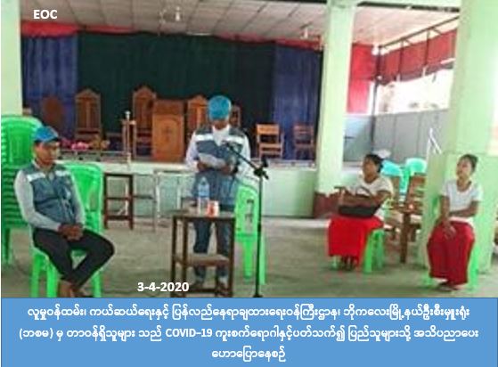 လူမှုဝန်ထမ်း၊ ကယ်ဆယ်ရေးနှင့် ပြန်လည်နေရာချထားရေးဝန်ကြီးဌာန၊ ဘေးအန္တရာယ်ဆိုင်ရာ စီမံခန့်ခွဲမှုဦးစီး ဌာန၊ ဘိုကလေးမြိုနယ်ဦးစီးမှူးရုံးမှ တာဝန်ရှိသူများသည် (၃-၄-၂၀၂၀) ရက်နေ့တွင် ဘိုကလေးမြို့နယ်၊ ဒေါင့်ကြီးကျေးရွာအုပ်စု၊ ကသမျှင်ကျေးရွာတွင် (၀၇:၃၀) နာရီ၌လည်းကောင်း၊ ကသပေါင်းကျေးရွာတွင် (၁၀:၃၀) နာရီ၌ လည်းကောင်း၊ ကွင်းဘုံကြီးကျေးရွာတွင် (၁၃:၄၅)နာရီ၌ လည်းကောင်း Covid- 19 ကူးစက် ရောဂါနှင့်ပတ်သက်ပြီး ဆောင်ရန်/ ရှောင်ရန်များနှိုးဆော်ခြင်းအား ကျန်းမာရေးဝန်ထမ်းများ၊ အုပ်ချုပ်ရေးမှူး ရပ်မိရပ်ဖများနှင့်အတူ ကျေးရွာနေပြည်သူတို့အား အသိပညာပေးခြင်းများဆောင်ရွက်ခဲ့ကြောင်း သိရှိရပါသည်။
