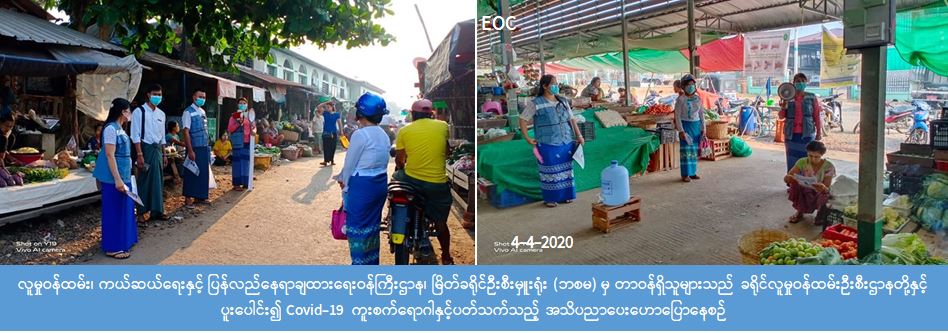 (၄-၄-၂၀၂၀) ရက်နေ့တွင် မြိတ်မြို့နယ်၊ တောရကျောင်းဈေး၊ ကုန်စိမ်းဈေး၊တပ်ပြင်ဈေးနှင့် ပျံကျဈေးတို့တွင် COVID- 19 ရောဂါကူးစက်ပြန့်ပွားမှုမရှိစေရေး အသိပညာပေးဆော်သြခြင်း၊ လက်ကမ်းစာစောင် ဝေငှပေးခြင်း၊ ဗီနိုင်းပိုစတာ ကပ်ခြင်းတို့အား လူမှုဝန်ထမ်း၊ ကယ်ဆယ်ရေးနှင့် ပြန်လည်နေရာချထားရေးဝန်ကြီးဌာန၊ ဘေးအန္တရာယ်ဆိုင်ရာ စီမံ ခန့်ခွဲမှုဦးစီးဌာန၊ မြိတ်ခရိုင်ဦးစီးမှူးရုံးမှတာဝန်ရှိသူများသည် ခရိုင်လူမှုဝန်ထမ်းဉီးစီးဌာနတို့နှင့်အတူ ပူးပေါင်း ဆောင်ရွက်ခဲ့ကြောင်း သိရှိရပါသည်။
