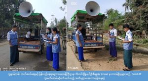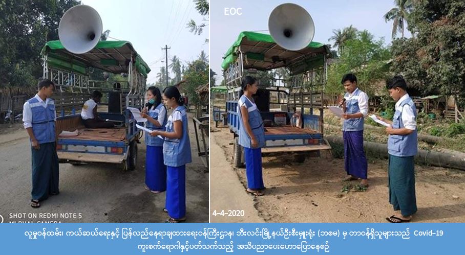 လူမှုဝန်ထမ်း၊ ကယ်ဆယ်ရေးနှင့် ပြန်လည်နေရာချထားရေးဝန်ကြီးဌာန၊ ဘေးအန္တရာယ်ဆိုင်ရာစီမံခန့်ခွဲမှုဉီးစီး ဌာန၊ မွန်ပြည်နယ်၊ သထုံခရိုင်၊ ဘီးလင်းမြို့နယ်ဉီးစီးမှူးရုံးမှ တာဝန်ရှိသူများသည် (၄-၄-၂၀၂၀) ရက်နေ့ (၀၈:၃၀) နာရီမှ စတင်ပြီး ဘီးလင်းမြို့နယ်၊ ဘိုးလှကြီးရပ်ကွက်နှင့် ကန်သာယာရပ်ကွက်တို့တွင် COVID -19 ကူးစက် ရောဂါနှင့်ပတ်သက်ပြီး ဆောင်ရန်/ ရှောင်ရန်အချက်များကို အသိပညာပေးကြေငြာခြင်းများဆောင်ရွက်ခဲ့ ကြောင်း သိရှိရပါသည်။
