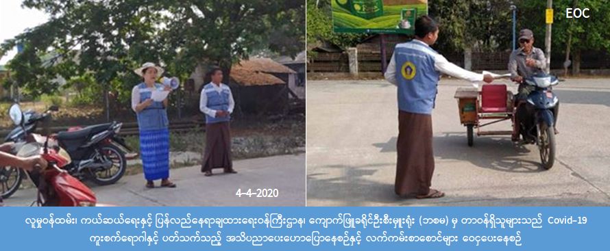 လူမှုဝန်ထမ်း၊ ကယ်ဆယ်ရေးနှင့် ပြန်လည်နေရာချထားရေးဝန်ကြီးဌာန၊ ဘေးအန္တရာယ်ဆိုင်ရာစီမံခန့်ခွဲမှုဦးစီးဌာန၊ ကျောက်ဖြူခရိုင်ဦးစီးမှုးရုံးမှ တာဝန်ရှိသူများသည် (၄- ၄-၂၀၂၀)ရက်နေ့ နံနက်(၀၈:၀၀) အချိန်မှ (၀၉:၀၀)အချိန်အထိ ကျောက်ဖြူမြို့နယ်၊ အရာရှိရပ်ကွက်တွင် COVID-19 ရောဂါ နှင့်ပတ်သက်၍ ဆောင်ရန်၊ရှောင်ရန်များအား သိရှိလိုက်နာဆောင်ရွက်နိုင်ရန် Hand Speaker ဖြင့် လိုက်လံနှိုးဆော်ခြင်းနှင့် လက်ကမ်းစာစောင်များဖြန့်ဝေခြင်းတို့ကို ဆောင်ရွက်ခဲ့ကြောင်း သိရှိရပါသည်။