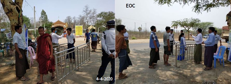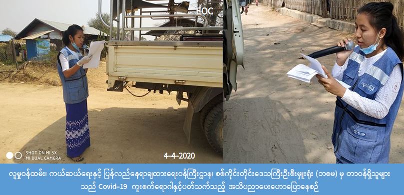 လူမှုဝန်ထမ်း၊ ကယ်ဆယ်ရေးနှင့် ပြန်လည်နေရာချထားရေးဝန်ကြီးဌာန၊ ဘေးအန္တရာယ်ဆိုင်ရာစီမံခန့်ခွဲမှုဦးစီးဌာန၊ စစ်ကိုင်းတိုင်းဒေသကြီးဦးစီးမှူးရုံးမှ တာဝန်ရှိသူများသည် ကျေးရွာအုပ်ချုပ်ရေးမှူးများ၊ ရပ်မိ/ရပ်ဖများနှင့်အတူ (၄-၄-၂၀၂၀)ရက်နေ့တွင် မုံရွာခရိုင်၊ အရာတော်မြို့နယ်အတွင်းရှိ ဝါးတန်းကျေးရွာ၊ ဆူးလေကုန်းကျေးရွာ၊ ရွာရှည်ကျေးရွာ၊ ဝါးပြစ်မကျေးရွာ၊ မိုဃ်းကာင်းကျေးရွာ၊ တောင်ရိုးကျေးရွာ၊ ကံစွယ်ကျေးရွာ၊ ရေတွင်းချောင်ကျေးရွာ၊ ဖားအောင်းတွင်းကျးရွာ၊ စည်ပင်သာကျေးရွာနှင့် ကျွန်းဖိုပင်ကျေးရွာများတွင် COVID-19 ရောဂါကူးစက်ပျံ့နှံ့မှုများမဖြစ်ပွားစေရန်အတွက် အများပြည်သူများ အလွယ်တကူ သိရှိလိုက်နာဆောင်ရွက်ရန်များကို အသိပေးဆောင်ရွက်ခြင်းလုပ်ငန်း များကို ဆောင်ရွက်ခဲ့ပါကြောင်း သတင်းပေးပို့အပ်ပါသည်။