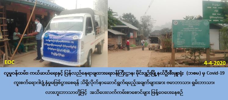 လူမှုဝန်ထမ်း၊ ကယ်ဆယ်ရေးနှင့် ပြန်လည်နေရာချထားရေးဝန်ကြီးဌာန၊ ဘေးအန္တရာယ်ဆိုင်ရာ စီမံခန့်ခွဲမှုဦးစီးဌာန၊ မိုင်းပျဉ်းမြို့နယ်ဦးစီးမှူးရုံးမှ တာဝန်ရှိသူများသည် (၄-၄-၂၀၂၀) ရက်နေ့တွင် မိုင်းပျဉ်းမြို့နယ် ဝမ်ဖြစ်ကျေးရွာနှင့် နောင်ဟွမ်းကျေးရွာတို့တွင် Covid-19 ရောဂါ ကူးစက်ပျံ့နှံ့မှုမဖြစ်ပွားစေရန် သိရှိလိုက်နာဆောင်ရွက်ရမည့်အချက်များကို ဗမာဘာသာ၊ ရှမ်းဘာသာ၊ လားဟူဘာသာတို့ဖြင့် အသိပေးဟောပြောခြင်း၊ လက်ကမ်းစာစောင်များ ဖြန့်ဝေခြင်းတို့ ပြုလုပ်ခဲ့ပါကြောင်း သိရှိရပါသည်။