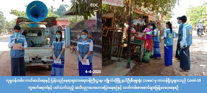 လူမှုဝန်ထမ်း၊ ကယ်ဆယ်ရေးနှင့် ပြန်လည်နေရာချထားရေးဝန်ကြီးဌာန၊ ဘေးအန္တရာယ်ဆိုင်ရာ စီမံခန့်ခွဲမှုဦးစီးဌာန၊ ကျိုက်ထိုမြို့နယ်ဦးစီးမှူးရုံးမှ တာဝန်ရှိသူများသည် (၄-၄-၂၀၂၀)ရက်နေ့ (၁၀:၀၀)အချိန်မှ (၁၃:၀၀) အချိန်ထိ သထုံခရိုင်၊ ကျိုက်ထိုမြို့နယ်၊ မလော့ချောင်ကျေးရွာ၊ ကျိုက္ကသာကျေးရွာနှင့် ခလွန်ကျေးရွာများအတွင်းရှိ လမ်းဆုံလမ်းခွများနှင့် လူစည်ကားရာနေရာ များတွင် COVID -19 ကူးစက်ရောဂါနှင့်ပတ်သက်၍ ကြိုတင်ကာကွယ် ထိန်းချုပ်နိုင်ရန် ပြည်သူ သို့ အသိပညာပေးပန်ကြားချက်များအား လှည့်လည်အသိပေးကြေငြာခြင်းနှင့် လက်ကမ်း စာစောင်များဖြန့်ဝေခြင်းတို့ ဆောင်ရွက်ခဲ့ကြောင်း သိရှိရပါသည်။