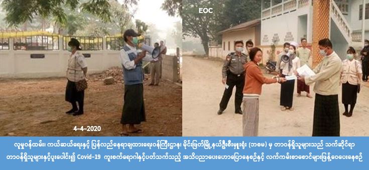 လူမှုဝန်ထမ်း၊ ကယ်ဆယ်ရေးနှင့် ပြန်လည်နေရာချထားရေးဝန်ကြီးဌာန၊ ဘေးအန္တရာယ်ဆိုင်ရာ စီမံခန့်ခွဲမှုဦးစီးဌာန၊ မိုင်းဖြတ်မြို့နယ်ဦးစီးမှူးရုံးမှတာဝန်ရှိသူများသည် မိုင်းဖြတ်မြို့နယ်အုပ်ချုပ် ရေးမှူး၊ မြို့နယ်ရဲမှူး၊ ကျေးလက်ကျန်းမာရေး၊ မြို့နယ်ပြန်ဆက်၊ မြို့နယ်ကြက်ခြေနီတို့နှင့် ပူးပေါင်း၍ (၄-၄-၂၀၂၀) ရက်နေ့၊နံနက်(၉)နာရီမှစ၍ မိုင်းဖြတ်မြို့နယ်၊ နမ့်ကုန်းကျေးရွာ၊ ခတ်တန်ကျေးရွာတို့တွင် COVID-19 ရောဂါ ကူးစက်ပျံ့နှံ့မှုများမဖြစ်ပွားစေရန်အတွက် လိုက်နာ ရန်၊ ဆောင်ရွက်ရန်များ ပြည်သူသို့ပန်ကြားချက်များကို မြန်မာ၊ ရှမ်း (၂) ဘာသာတို့ဖြင့် အသိပညာပေးဟောပြောခဲ့ပြီး လက်ကမ်းစာစောင်များဖြန့်ဝေခြင်းတို့ကို ဆောင်ရွက်ခဲ့ကြောင်း သိရှိရပါသည်။