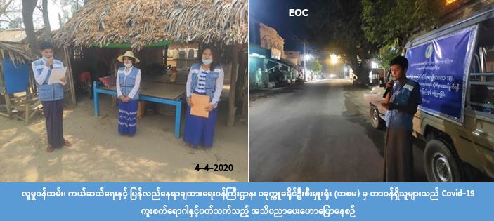 လူမှုဝန်ထမ်း၊ ကယ်ဆယ်ရေးနှင့် ပြန်လည်နေရာချထားရေးဝန်ကြီးဌာန၊ ဘေးအန္တရာယ်ဆိုင်ရာစီမံခန့်ခွဲမှုဉီးစီးဌာန၊ ပခုက္ကူခရိုင်ဦးစီးမှူးရုံးမှ တာဝန်ရှိသူများသည် (၄-၄-၂၀၂၀) ရက်နေ့ (၀၇:၀၀)အချိန်မှ (၁၃:၃၀)အချိန်ထိပခုက္ကူမြို့နယ်၊ ဖောင်းကွဲကျေးရွာအုပ်စု၊ ဝါးကျွန်းတွင်းကျေးရွာ၊ မကျည်းတန်းကျေးရွာ၊ အင်းဘတ်ကျေးရွာ၊ ကျတ်ထိုးကျေးရွာအုပ်စု၊ အုန်းတောကျေးရွာ၊ ကျတ်ထိုးကျေးရွာ၊ အနောက်ကုန်းကျေးရွာနှင့် ကျပ်ပြည့်ကျေးရွာများသို့ သွားရောက်အသိပညာပေးဟောပြောခြင်းနှင့် နေ့စဉ် (၁၉:၀၀)အချိန်မှ (၂၁:၀၀)အချိန်အထိ ပခုက္ကူမြို့ပေါ်ရပ်ကွက်များသို့ COVID -19 ကူးစက်မြန်ရောဂါ ကြိုတင်ကာကွယ်ရေးပြည်သူများသို့ အသိပညာပေးပန်ကြားချက်များအား လှည့်လည်ဟောပြော ခြင်းတို့ကို ဆောင်ရွက်ခဲ့ပါကြောင်း သိရှိရပါသည်။