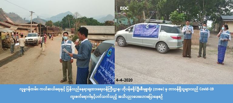လူမှုဝန်ထမ်း၊ ကယ်ဆယ်ရေးနှင့် ပြန်လည်နေရာချထားရေးဝန်ကြီးဌာန၊ ဘေးအန္တရာယ်ဆိုင်ရာ စီမံခန့်ခွဲမှု ဦးစီးဌာန ဟိုပန်ခရိုင်ဦးစီးမှူးရုံးမှ တာဝန်ရှိသူများသည် (၄-၄-၂၀၂၀) ရက်နေ့တွင် ဟိုပန်မြို့၊ နောင်မွန်ကျေးရွာ၊ ကောင်းကော်ကျေးရွာ၊ ဟိုပင်ကြိုင်းကျေးရွာတို့၌ Covid-19 ရောဂါကူးစက်ပျံ့နှံ့မှုမဖြစ်ပွားစေရန် သိရှိလိုက်နာ ဆောင်ရွက်ရမည့်အချက်များကို အသိပေးဟောပြောခြင်း၊ လက်ကမ်းစာစောင်များဖြန့်ဝေခြင်းတို့ ဆောင်ရွက်ခဲ့ ကြောင်း သိရှိရပါသည်။