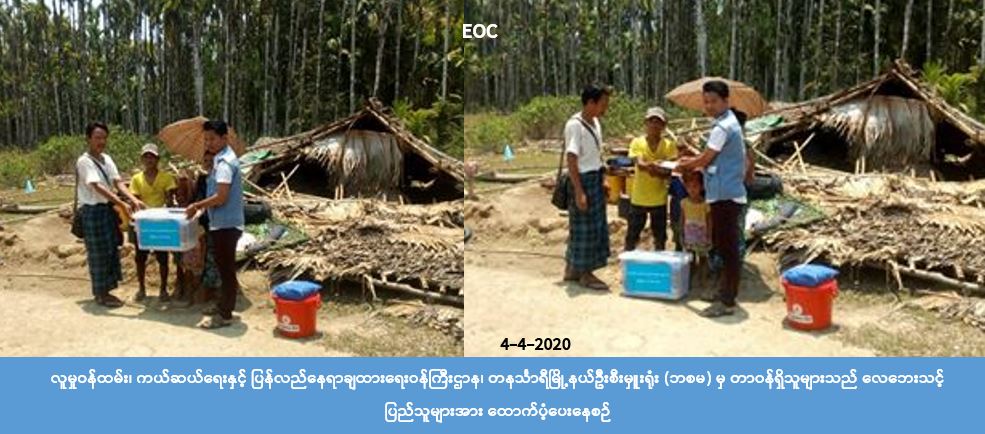 (၃-၄-၂၀၂၀)ရက်နေ့တွင် တနင်္သာရီမြို့နယ်၊ ကော့မပြင်းကျေးရွာ လေဘေးကြောင့် ပြိုလဲပျက် စီးအိမ် (၁) လုံးအတွက် ကယ်ဆယ်ရေးပစ္စည်း (၁၆)မျိုး (၁)စုစာ၊အိမ်ဆောက်ပစ္စည်းဘိုး (၁၀၀,၀၀၀) ကျပ်နှင့် လူ(၅) ဦးအတွက်ဆန်ဘိုး (၁၀,၅၀၀) တို့အား (၄-၄-၂၀၂၀)နေ့ နံနက်(၁၁: ၄၀) အချိန်တွင် လူမှုဝန်ထမ်း၊ကယ်ဆယ်ရေးနှင့် ပြန်လည်နေရာချထားရေးဝန်ကြီးဌာန၊ ဘေးအန္တရာယ်ဆိုင်ရာ စီမံခန့်ခွဲမှုဦးစီးဌာန၊ တနင်္သာရီမြို့နယ်ဦးစီးမှူးရုံး မှ သွားရောက်ထောက်ပံ့ ခဲ့ကြောင်း သိရှိရပါသည်။