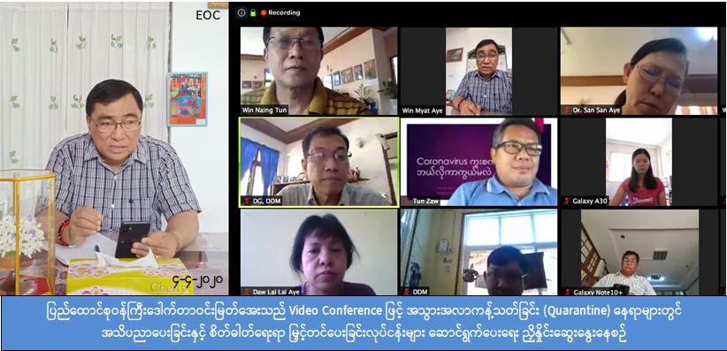 Coronavirus Disease 2019 (COVID -19) ကာကွယ်၊ ထိန်းချုပ်၊ ကုသရေးနှင့် ပတ်သက်၍ လူမှုဝန်ထမ်း၊ ကယ်ဆယ်ရေးနှင့် ပြန်လည်နေရာချထားရေးဝန်ကြီးဌာနက နေပြည်တော်ကောင်စီ အပါအဝင် ပြည်နယ်နှင့်တိုင်းဒေသကြီးများအတွင်း ပြည်သူလူထု၏ ဝိုင်းဝန်းပူးပေါင်းကူညီ စောင့်ရှောက်မှုဖြင့် သတ်မှတ်နေရာအဆောက်အဦများတွင်ထားရှိပြီး အသွားအလာကန့်သတ်ခြင်း (Community Based Facility Quarantine) ဆောင်ရွက်ပေးနေသည့် နေရာများ၌ အသိပညာပေး ခြင်းနှင့် စိတ်ဓါတ်ရေးရာမြှင့်တင်ပေးခြင်းလုပ်ငန်းများ ဆောင်ရွက်ပေးနိုင်ရေးအတွက် ယနေ့နံနက် ပိုင်းက Video Conference ဖြင့် ညှိနှိုင်း ဆွေးနွေေခဲ့ပါသည်။