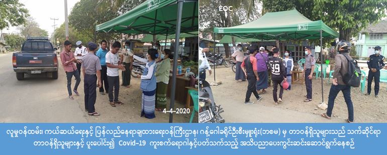 လူမှုဝန်ထမ်း၊ ကယ်ဆယ်ရေးနှင့် ပြန်လည်နေရာချထားရေးဝန်ကြီးဌာန၊ ဘေးအန္တရာယ်ဆိုင်ရာ စီမံခန့်ခွဲမှုဦးစီးဌာန၊ ဂန့်ဂေါခရိုင်ဦးစီးမှူးရုံးမှ တာဝန်ရှိသူများသည် (၄-၄-၂၀၂၀) ရက်နေ့ (၀၈:၃၀) နာရီအချိန်မှ (၁၇:၃၀)နာရီအချိန်ထိ လတ်တလော နိုင်ငံအသီးသီးတွင် ကူးစက်ပြန့်ပွားလျက်ရှိသော Covid-19 ကူးစက်ရောဂါကြိုတင် ကာကွယ် ရေးအတွက် ဂန့်ဂေါခရိုင်အတွင်း ယာဉ်အဝင်အထွက်စီးနင်း လိုက်ပါလာသော ခရီးသည်များအား ကိုယ်အပူချိန်များ တိုင်းတာပေးခြင်းနှင့် ပြည်တွင်းပြည်ပမှ ပြန်လာသူများအား စာရင်းပြုစုခြင်းတို့ကို ခရိုင်အုပ်ချုပ်ရေးမှူး၊ မြို့နယ်အုပ်ချုပ်ရေးမှူး၊ ဌာနဆိုင်ရာအသီးသီးမှ တာဝန်ရှိသူများနှင့်အတူ ပူးပေါင်းပါဝင်ဆောင်ရွက်ခဲ့ကြောင်း သိရှိရပါသည်။