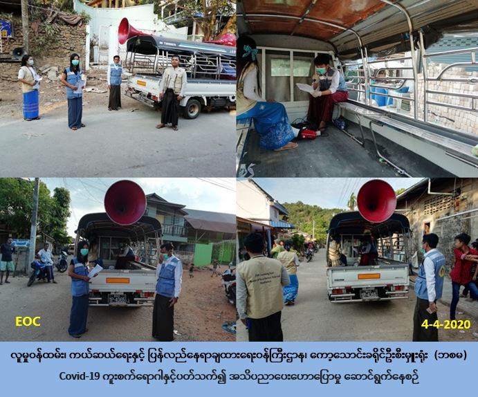 လူမှုဝန်ထမ်း၊ ကယ်ဆယ်ရေးနှင့် ပြန်လည်နေရာချထားရေးဝန်ကြီးဌာန၊ ဘေးအန္တရာယ်ဆိုင်ရာ စီမံခန့်ခွဲမှုဉီးစီးဌာန၊ ကော့သောင်းခရိုင်ဦးစီးမှူးရုံးမှ တာဝန်ရှိသူများသည် (၄-၄-၂၀၂၀) ရက်နေ့တွင်၊ ကော့သောင်းမြို့၊ ပိတောက်ရွှေဝါရပ်ကွက်အတွင်းရှိ ပြည်သူများအား covid-19 ရောဂါနှင့်ပက်သက်၍ အသိပညာပေးခြင်း၊ လော်စပီကာ၊ Hand Speaker ဖြင့် လိုက်လံဆော်ဩခြင်းများ ဆောင်ရွက်ခဲ့ပါကြောင်း သိရှိရပါသည်။