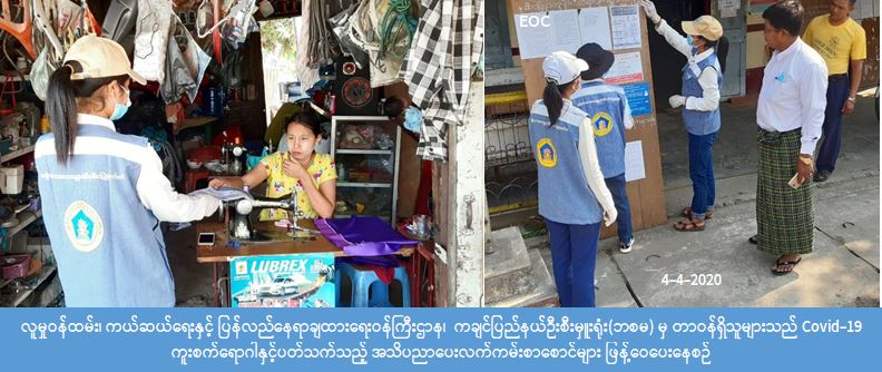 လူမှုဝန်ထမ်း၊ ကယ်ဆယ်ရေးနှင့် ပြန်လည်နေရာချထားရေးဝန်ကြီးဌာန၊ ဘေးအန္တရာယ်ဆိုင်ရာ စီမံခန့်ခွဲမှုဦးစီးဌာန၊ ကချင်ပြည်နယ်ဦးစီးမှူးရုံးမှ တာဝန်ရှိသူများသည် (၄-၄-၂၀၂၀) ရက်နေ့တွင် Covid-19 နှင့်ပတ်သက်၍ မြစ်ကြီးနား မြို့နယ်ရှိ၊ မြေမြင့်ရပ်ကွက်၊ ပမ္မတီးရပ်ကွက်၊ ခေမာသီရိရပ်ကွက်၊ အောင်နန်းရပ်ကွက်၊ မြို့သစ်ရပ်ကွက်တို့၌ အသက်ရှူလမ်းကြောင်းဆိုင်ရာ ကူးစက်ရောဂါ Covid-19 ကာကွယ်၊ တားဆီး၊ ထိန်းချုပ်ကုသရေးဆိုင်ရာ ပြည်သူ့ပန်ကြားချက်အသိပညာပေးမှုအား အသံချဲ့စက်ဖြင့် လှည့်လည်ဟောပြောခြင်းနှင့် အသိပညာပေး လက်ကမ်းစာစောင်ဖြန့်ဝေခြင်းတို့အားဆောင်ရွက်ခဲ့ကြောင်း သိရှိရပါသည်။