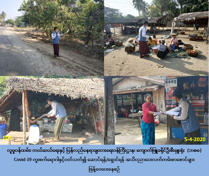 လူမှုဝန်ထမ်း၊ ကယ်ဆယ်ရေးနှင့် ပြန်လည်နေရာချထားရေးဝန်ကြီးဌာန၊ ဘေးအန္တရာယ်ဆိုင်ရာစီမံခန့်ခွဲမှုဦးစီးဌာန၊ ကျောက်ဖြူခရိုင်ဦးစီးမှူးရုံးမှ တာဝန်ရှိသူများသည် (၅- ၄-၂၀၂၀) ရက်နေ့ နံနက် (၀၈း၀၀) အချိန်မှ (၀၉း၀၀) အချိန်အထိ ကျောက်ဖြူမြို့နယ်၊ အုန်းတောကျေးရွာတွင် COVID-19 ရောဂါနှင့်ပတ်သက်၍ ဆောင်ရန်/ရှောင်ရန်များအား သိရှိလိုက်နာဆောင်ရွက်နိုင်ရန် လက်ကမ်းစာစောင်များဖြန့်ဝေခြင်း Hand Speaker ဖြင့် လိုက်လံနှိုးဆော်ခြင်းတို့ကို ဆောင်ရွက်ခဲ့ပါကြောင်း သိရှိရပါသည်။