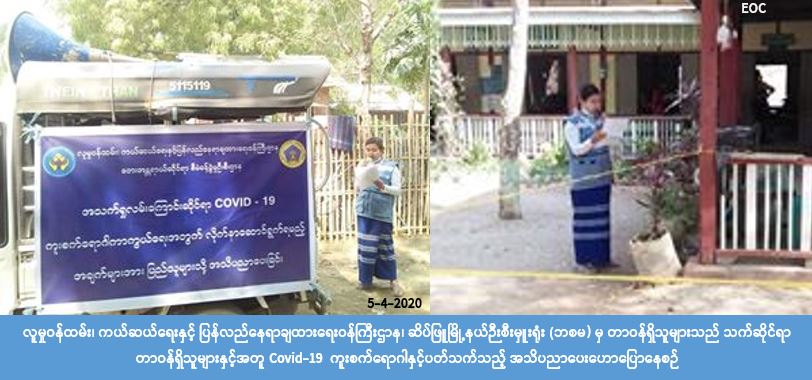 လူမှုဝန်ထမ်း၊ ကယ်ဆယ်ရေးနှင့် ပြန်လည်နေရာချထားရေးဝန်ကြီးဌာန၊ အန္တရာယ်ဆိုင်ရာ စီမံခန့်ခွဲမှု ဦးစီးဌာန၊ မကွေးတိုင်းဒေသကြီး၊ ပခုက္ကူခရိုင်၊ ဆိပ်ဖြူမြို့နယ်ဦးစီးမှူး ရုံးမှတာဝန်ရှိသူများ သည် (၅-၄-၂၀၂၀)ရက်နေ့ နံနက် (၀၉:၀၀) အချိန်မှ (၁၃:၀၀) အချိန်အထိ ချောင်းမ ကြီးကျေးရွာအုပ်စုရှိ ချောင်းမ ကြီး(အရှေ့) ကျေးရွာ၊ ချောင်းမကြီး(အနောက်) ကျေးရွာ၊ မယ်ဇလီကွေ့ ကျေးရွာနှင့် တူရွင်းမျော ကျေးရွာတို့တွင် လှည့်လည်၍ ကျန်းမာရေးဌာနမှ တာဝန်ရှိသူများ၊ လူငယ်ရေး ရာကော်မတီ၊ မြင့်မြတ် စေတနာပရဟိတအသင်း၊ ကျေးရွာအုပ်ချုပ်ရေးမှူး၊ ရပ်ကျေးစာရေးနှင့်အတူ ပူး ပေါင်းကာ Covid- 19 ရောဂါနှင့်ပတ်သက်၍ ဆောင်ရန်၊ ရှောင်ရန်အချက်များအား အသိပညာပေးခြင်းများ ဆောင်ရွက်ခဲ့ ကြောင်း သိရှိရပါသည်။