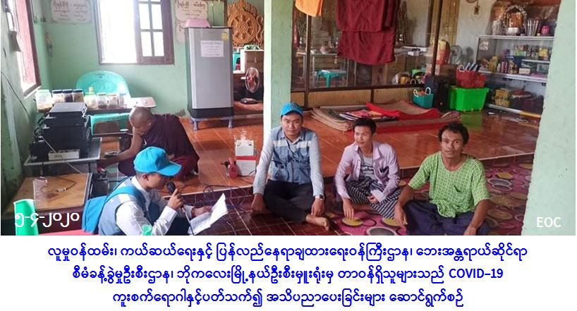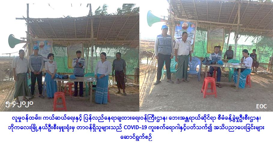 လူမှုဝန်ထမ်း၊ ကယ်ဆယ်ရေးနှင့် ပြန်လည်နေရာချထားရေးဝန်ကြီးဌာန၊ ဘေးအန္တရာယ်ဆိုင်ရာစီမံ ခန့်ခွဲမှုဦးစီးဌာန၊ ဘိုကလေးမြို့နယ်ဦးစီးမှူးရုံးမှ တာဝန်ရှိသူများသည် (၅-၄-၂၀၂၀) ရက်နေ့တွင် ဘိုကလေးမြို့နယ်၊ ခနောင်ကျေးရွာအုပ်စု၊ ခနောင်ကျေးရွာ၌ (၀၉:၀၀) နာရီအချိန်တွင် လည်းကောင်း၊ ကနိကြီးကျေးရွာ၌ (၁၀:၀၀) နာရီအချိန်တွင်လည်းကောင်း၊ ရပ်ဖရုံကျေးရွာ၌ (၁၂:၀၀) နာရီအချိန်တွင်လည်းကောင်း Covid-19 ကူးစက်ရောဂါနှင့်ပတ်သက်ပြီး ဆောင်ရန်/ ရှောင်ရန်များ နှိုးဆော်ခြင်း လူမှုဝန်ထမ်းဦးစီးဌာနမှ တာဝန်ရှိသူများ၊ ကျေးရွာရှိ အုပ်ချုပ်ရေးမှူး၊ ရပ်မိရပ်ဖများနှင့်အတူ ကျေးရွာနေပြည်သူတို့အား အသိပညာပေးခြင်းများ ဆောင်ရွက်ခဲ့ကြောင်း သတင်းရရှိပါသည်။