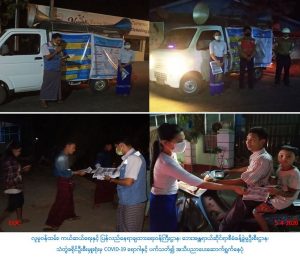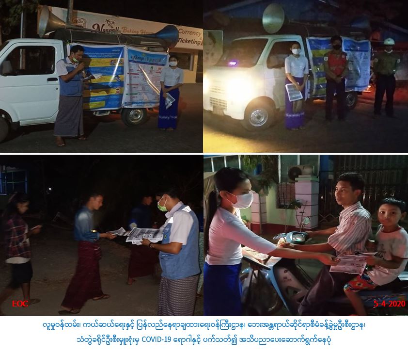 လူမှုဝန်ထမ်း၊ ကယ်ဆယ်ရေးနှင့် ပြန်လည်နေရာချထားရေးဝန်ကြီးဌာန၊ ဘေးအန္တရာယ်ဆိုင်ရာစီမံခန့်ခွဲမှုဦးစီး ဌာန၊ ရခိုင်ပြည်နယ်၊ သံတွဲခရိုင်ဦးစီးမှူးရုံးမှ တာဝန်ရှိသူများသည် ခရိုင်/ မြို့နယ်အထွေထွေအုပ်ချုပ်ရေးဦးစီးဌာန၊ သံတွဲမြို့နယ် သိမ်ကုန်းကျောင်းနာယကဆရာတော်နှင့် ပူးပေါင်း၍ (၅-၄-၂၀၂၀) ရက်နေ့၊ ည(၁၈:၀၀)နာရီမှ (၂၁:၃၀)နာရီချိန် အထိသံတွဲမြို့နယ်၊ ငပလီမြို့ ဂျိတ္တောရပ်ကွက်၊ မြပြင်ရပ်ကွက်၊ လင်းသာရပ်ကွက်အတွင်း လှည့်လည်ပြီး ကိုရိုနာဗိုင်းရပ်စ်ရောဂါ/ Covid-19 ကာကွယ်၊ တားဆီး၊ ထိန်းချုပ်၊ ကုသရေးဆိုင်ရာပန်ကြားချက် များအား ပြည်သူလူထုသို့ အသိပညာပေးလှည့်လည် ဟောပြောခြင်းနှင့် လက်ကမ်းစာစောင်များ ဖြန့်ဝေပေးခြင်းများ ဆောင်ရွက်ခဲ့ပါကြောင်း သတင်းရရှိပါသည်။